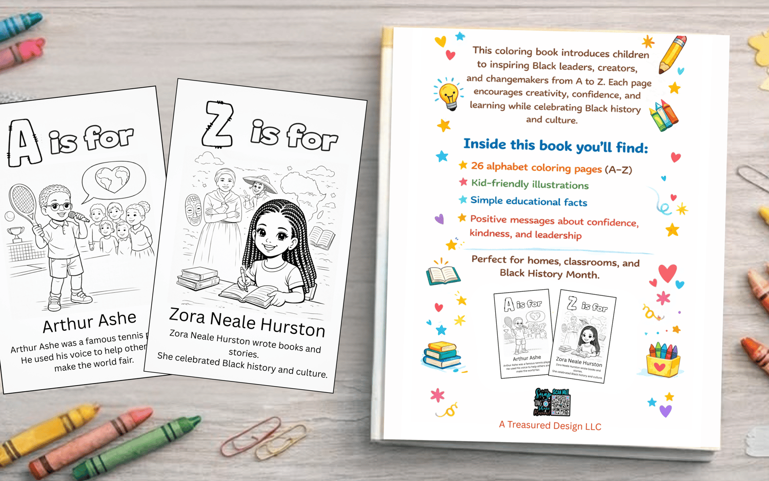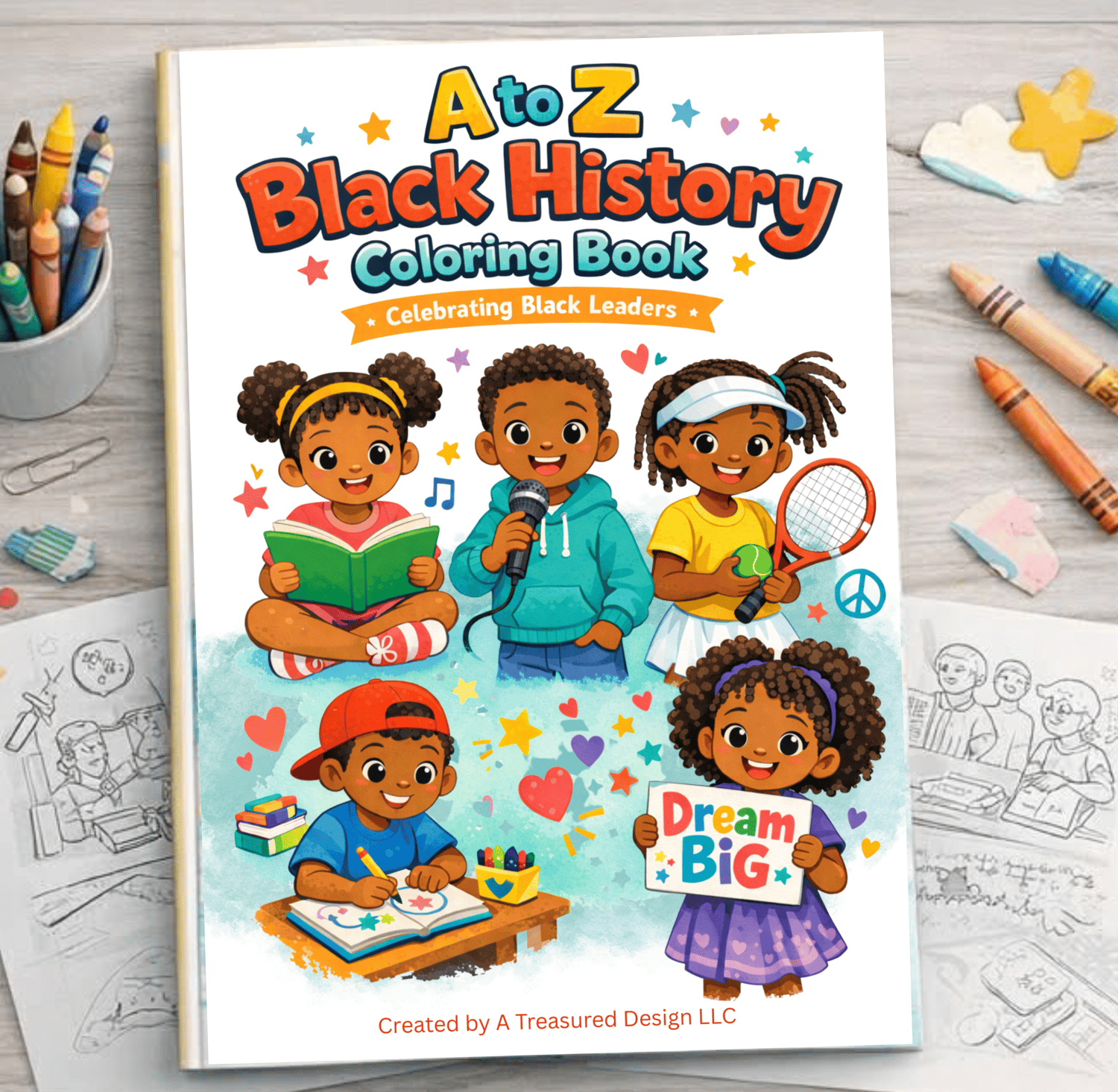 This A to Z Black History Coloring Book features 26 engaging coloring pages, each highlighting an inspiring Black leader or changemaker—from A to Z. Every page includes a kid-friendly illustration and simple educational facts designed to build confidence, curiosity, and pride.