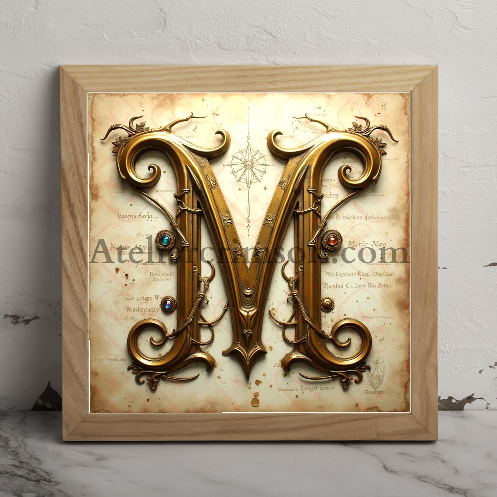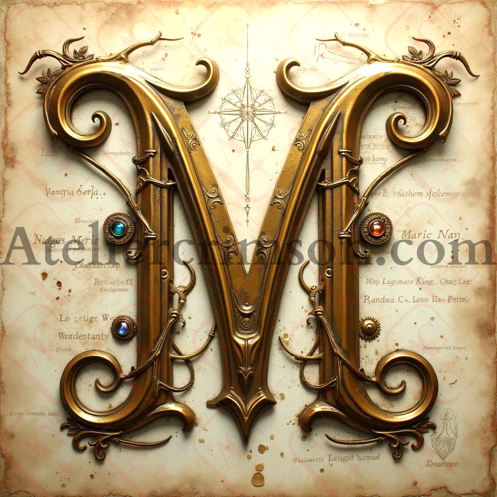 The letter M Art Nouveau alchemical Each character crafted as a stunning 3D brass sculpture with weathered patina, set against a mystical alchemical parchment. Ornate vines, floating bubbles, and antique gears create a magical shabby chic atmosphere. Perfect for vintage-inspired designs, book covers, or unique wall art."
