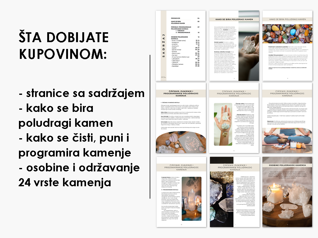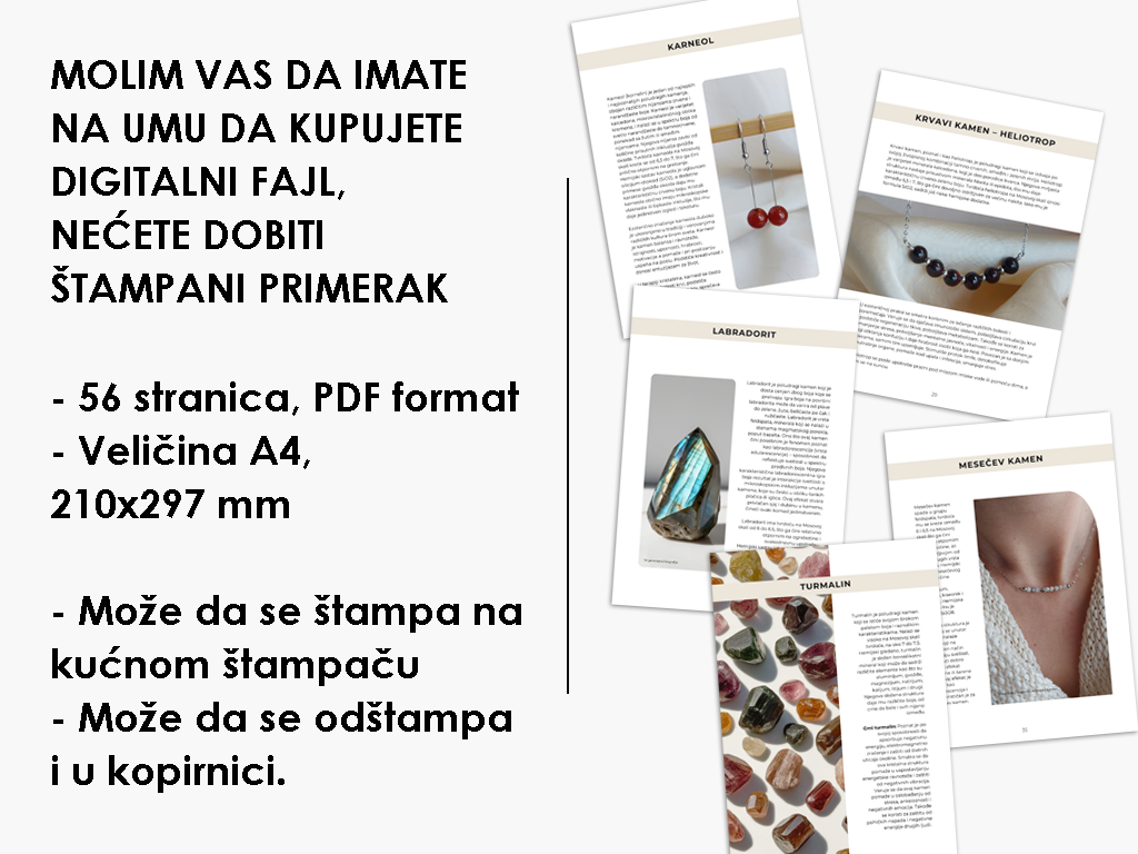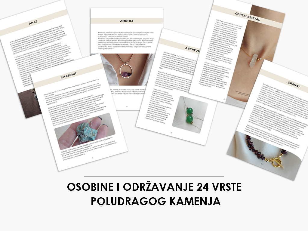 U ovoj e-knjizi je opisano kako se bira poludragi kamen, kako se čisti i programira kao i osobine 24 poludraga kamena koja najčešće koristim u izradi nakita.