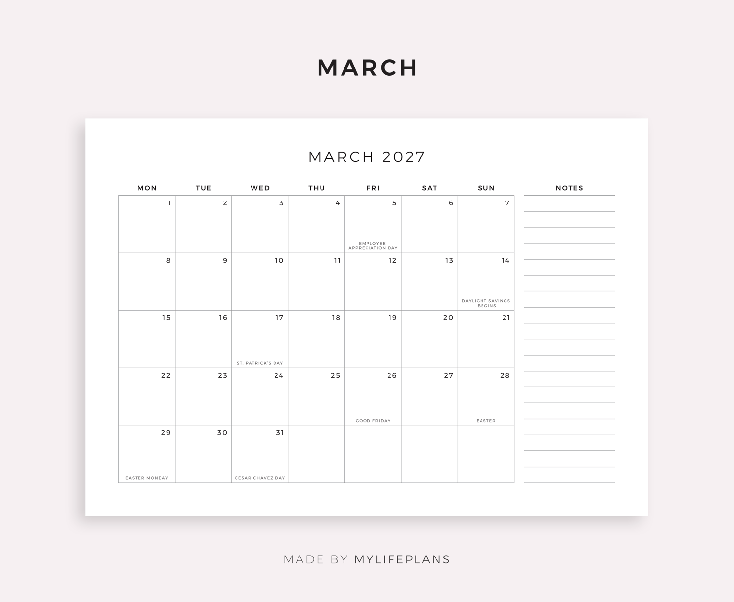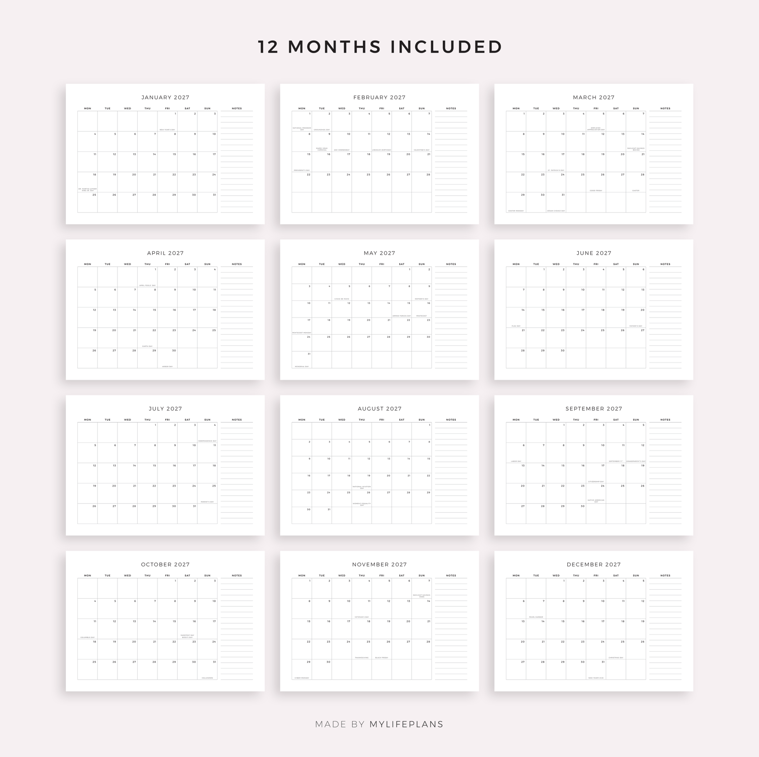 This is a printable 2027 monthly planner with holidays — just download, print, and start using it right away.