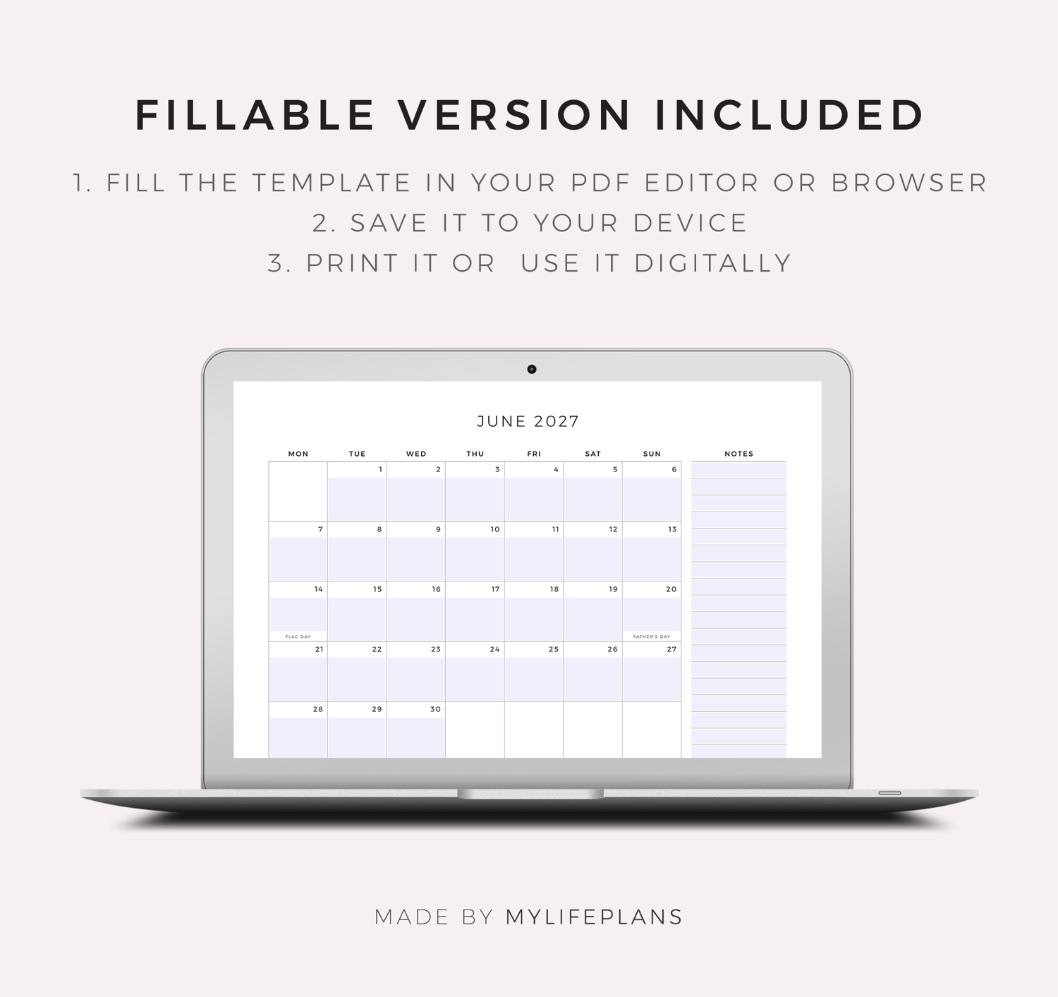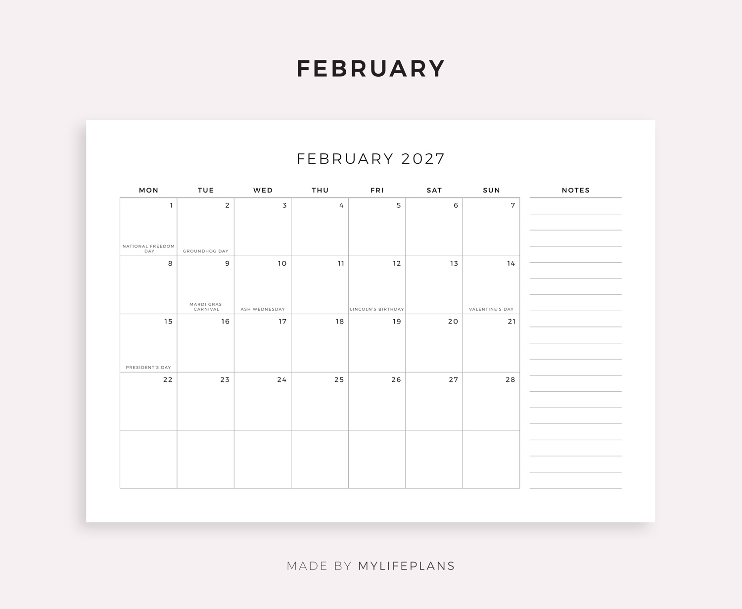 2027 Monthly Planner with Holidays, A4/Letter Size, Printable & Fillable PDF