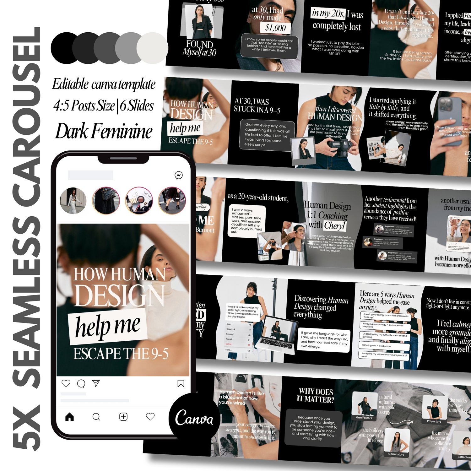 ✅ 5 Seamless Carousel Templates (6 slides each – 1080x1350 px, 4:5 ratio)
