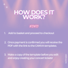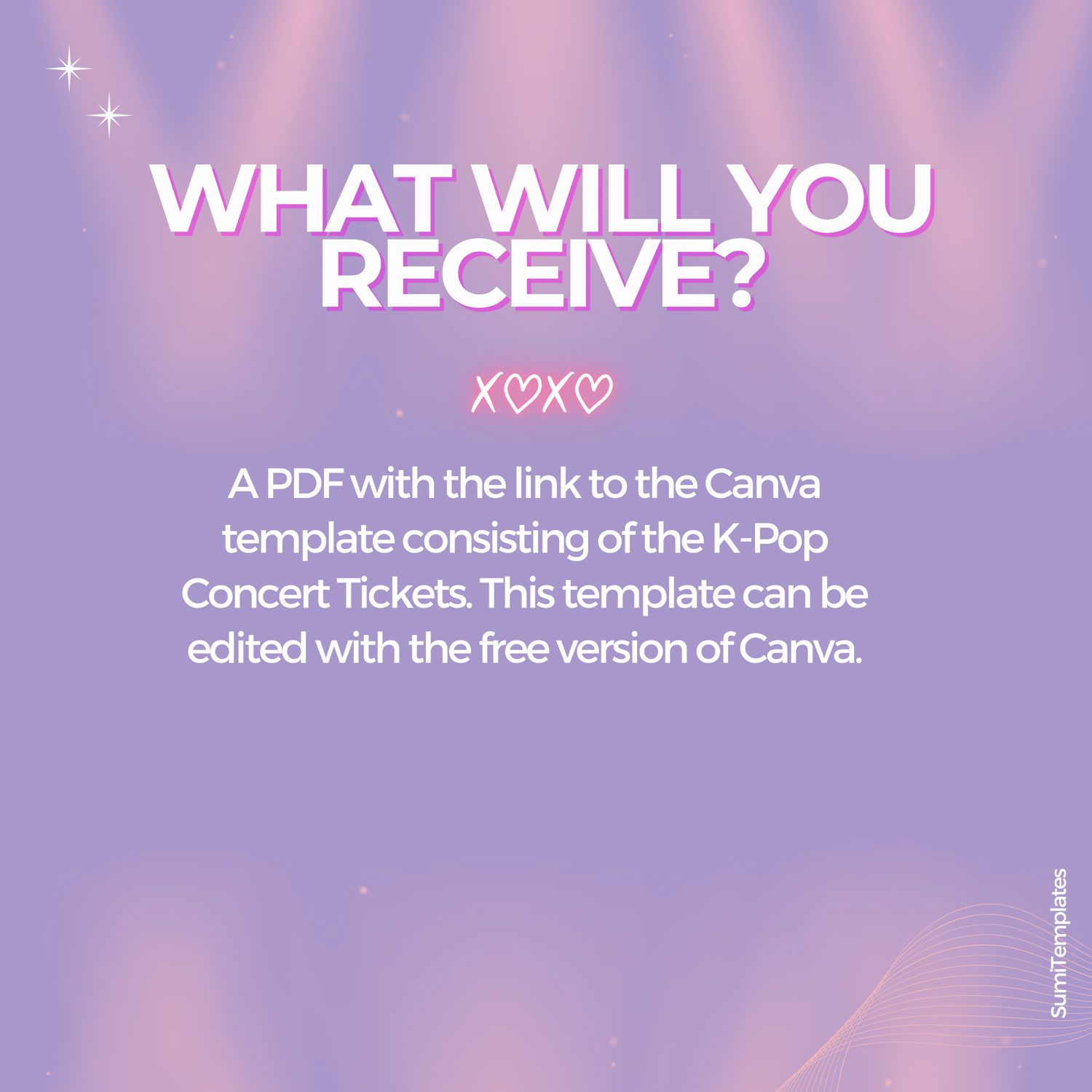 Make your own K-Pop Concert Tickets for your own collection or to give as a surprise gift to a K-Pop Fan. Our easy to use Canva template empowers you to design captivating tickets effortlessly, enabling you to personalize elements like the concert's name, date, venue, and more. Print these special surprise tickets at home and gift a truly unforgettable adventure to your loved ones!