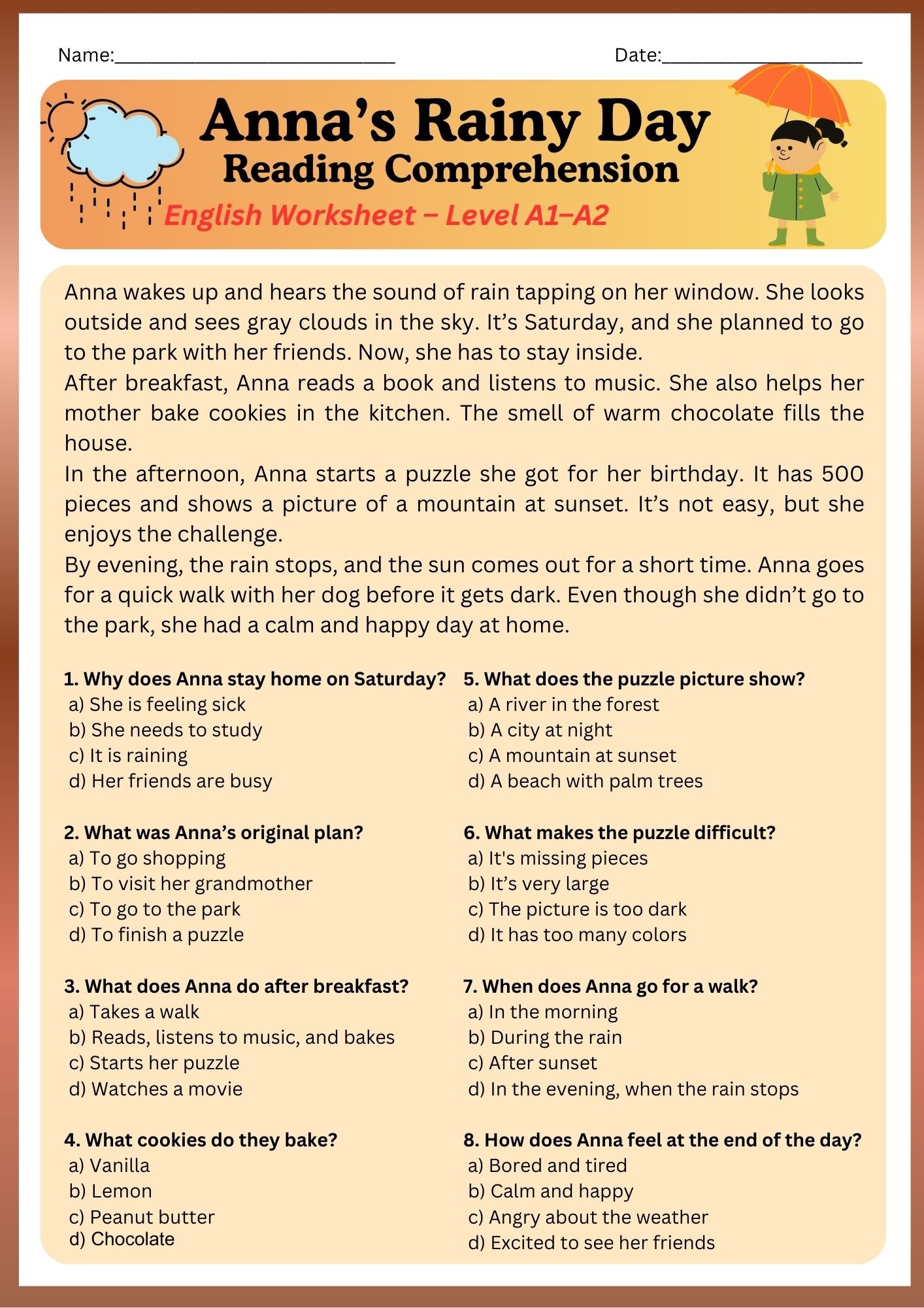 Reading Comprehension – Anna’s Rainy Day (A1–A2 Level) ✔ Includes Color & B&W Versions + Multiple-Choice Questions