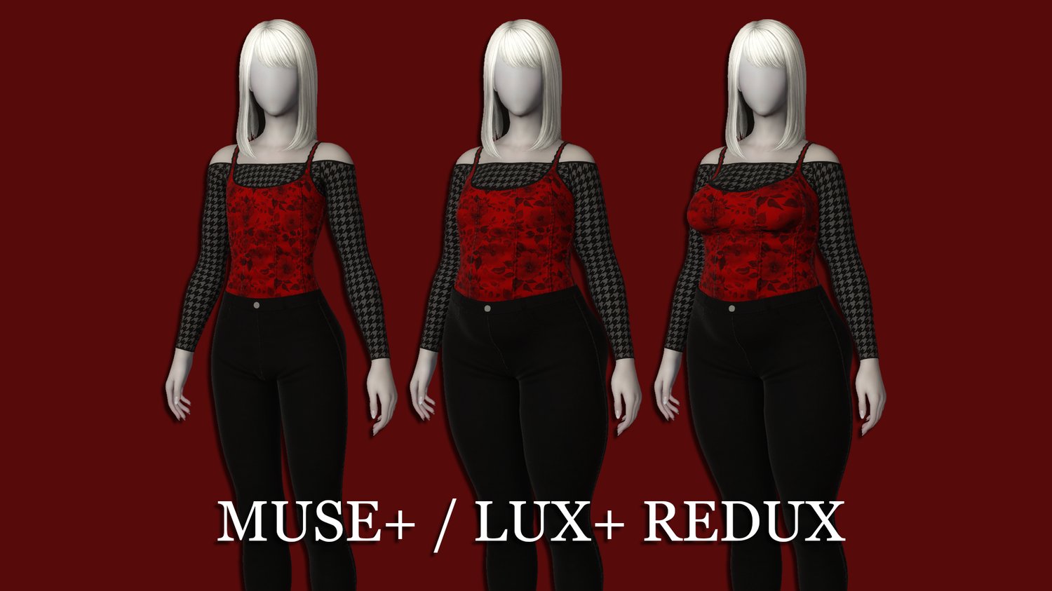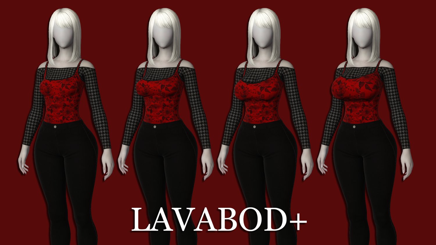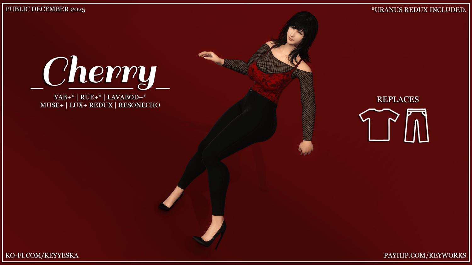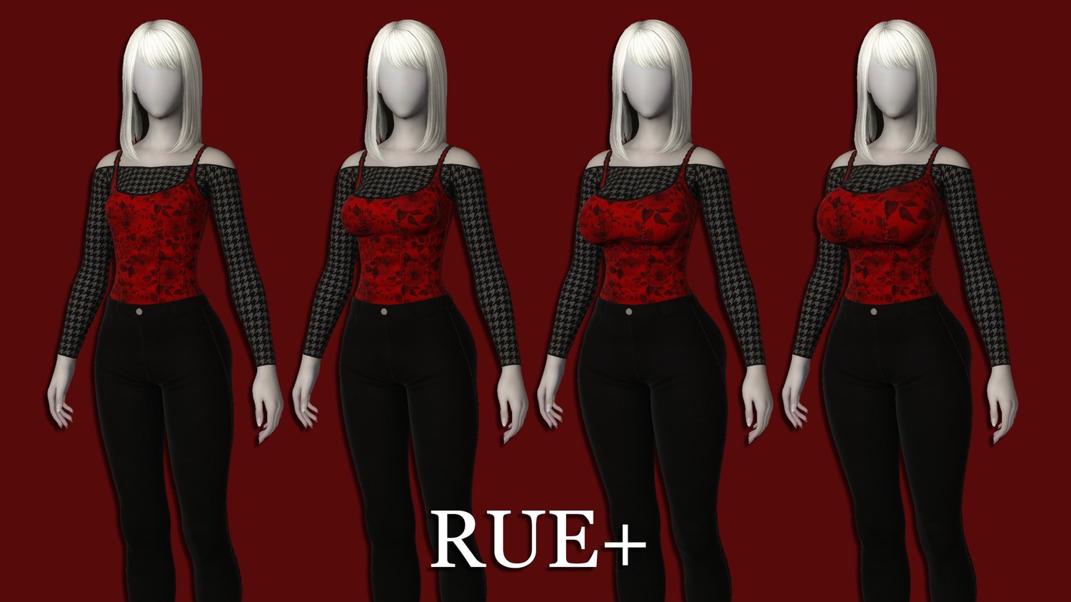 Custom mesh and textures. Created with Blender, Substance Painter, and Photoshop. Thumbnail shows outfit on Omoi and Standard legs (LaRue+) with Customize+ on.