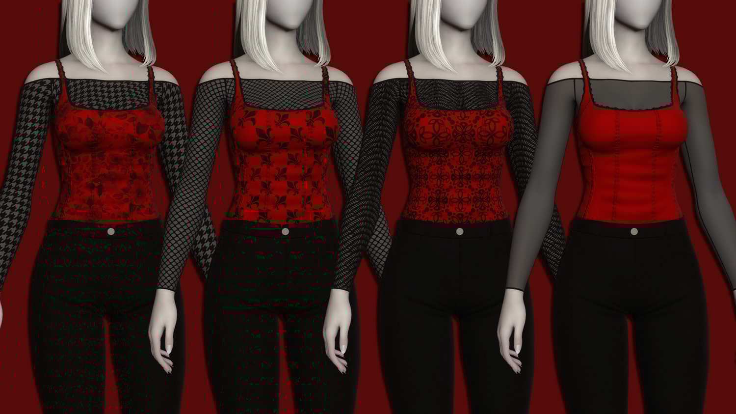 Outfit is assembled of a low-cut tank with lace trims, a sheer undershirt, and low-cut pants. Both tank top and undershirt come with several patterns for mixing and matching, undershirt can be toggled, and everything has dual dyeing.