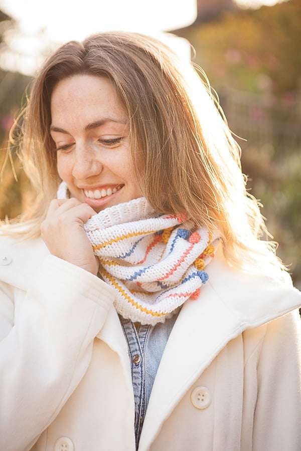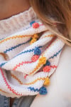 Complimentary colours and sweet looking bobbles make this cowl a stand-out accessory. A quick knit you can wear through so many seasons, you’ll be making numerous versions over many years.