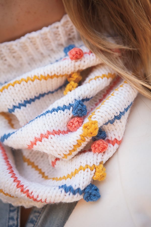 The cowl is worked bottom up, in the round. Single-round stripes of colour with a bobble at the beginning of the round add a pop of colour.