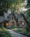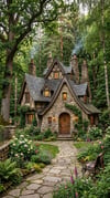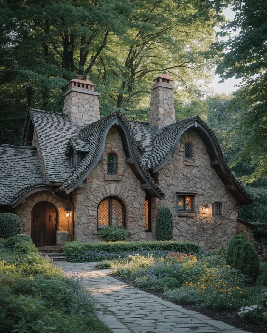 Step into a storybook world with this Fairytale Stone Cottage, nestled in a lush forest clearing surrounded by tall green trees. Built from natural irregular stone, the cottage features curved gabled roofs, tall chimneys, arched doorways, and charming leaded glass windows, capturing a whimsical medieval European style.