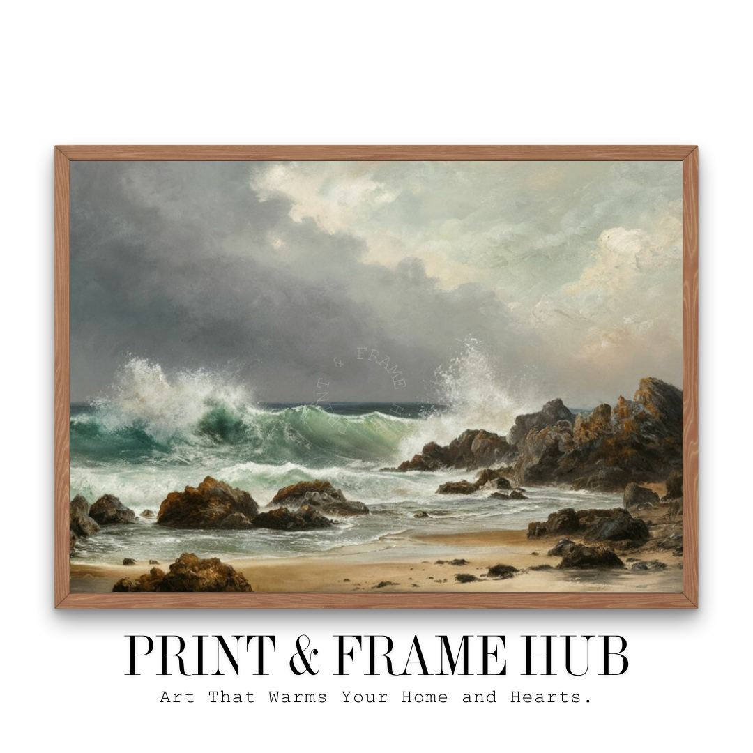 This dramatic painting captures the power of ocean waves crashing against rocky shores under a stormy sky. The artist's use of light and shadow brings the turbulent sea to life, creating a mesmerizing scene. Perfect for adding natural drama to any home, this artwork brings the ocean's majesty and energy indoors. Ideal for coastal decor enthusiasts and nature lovers, it's a standout piece for any wall.