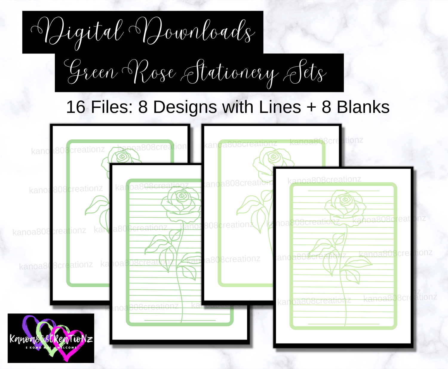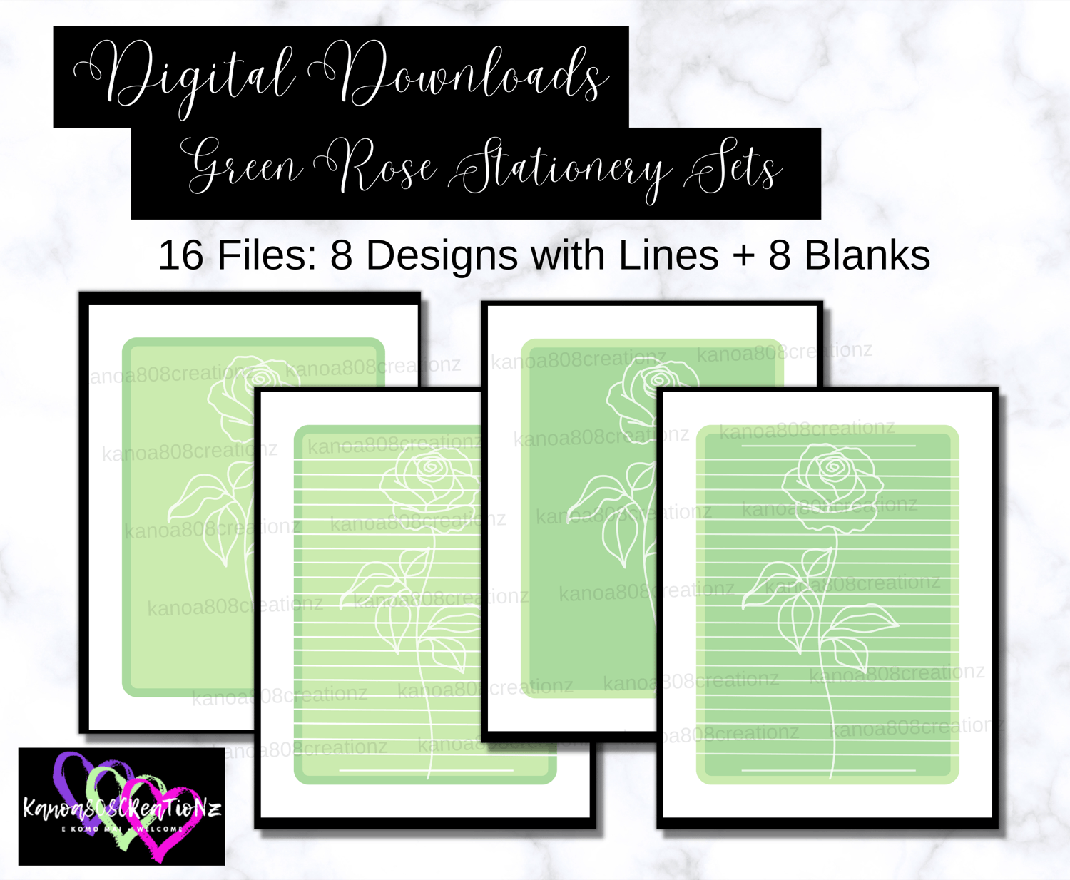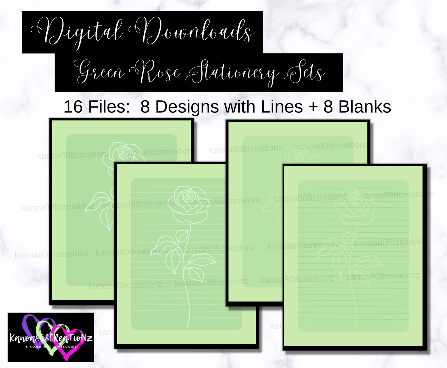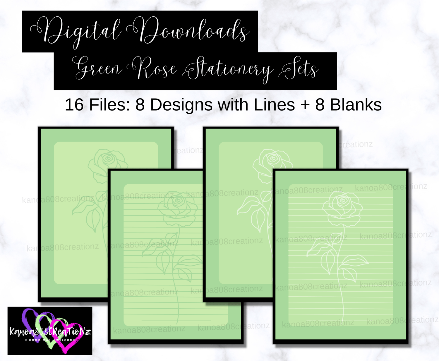 16 Digital Downloadable & Printable FIles: Green Roses Stationery Set
