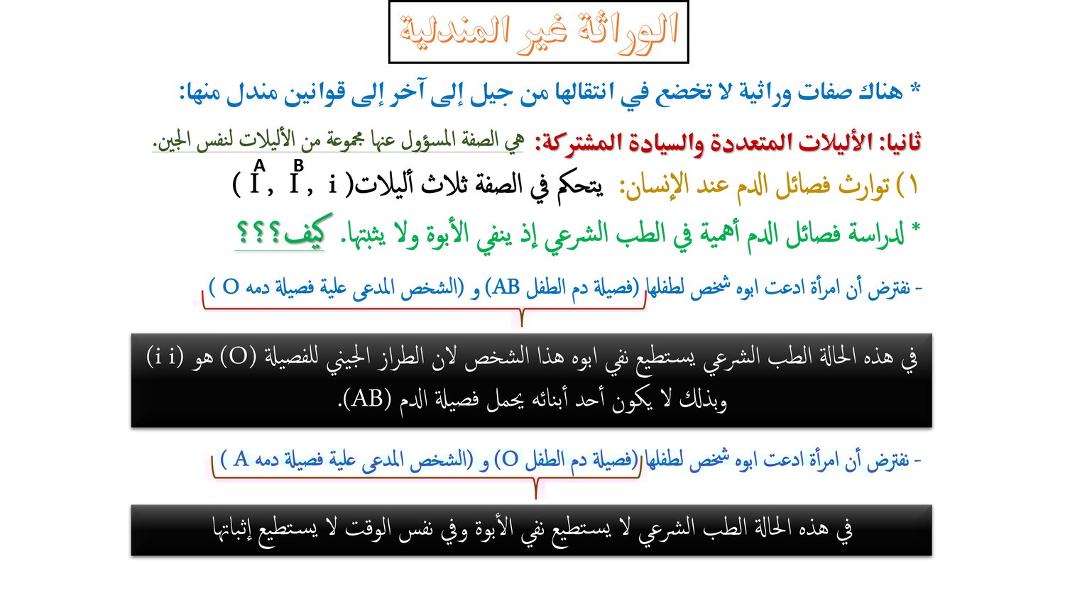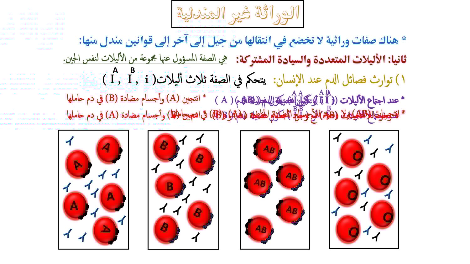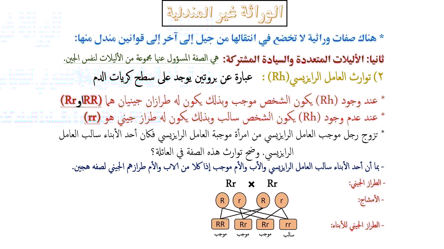 العرض يحتوي على شرح درس الوراثة غير المندلية (السيادة المشتركة والاليلات المتعدة) مع حل بعض الامثلة ووراثة العامل الرايسيسي كذلك