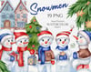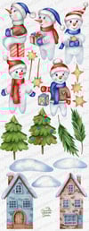 Snowmen. Christmas tree toys. Fir branches, stars, winter toy houses. Winter & New Year theme.