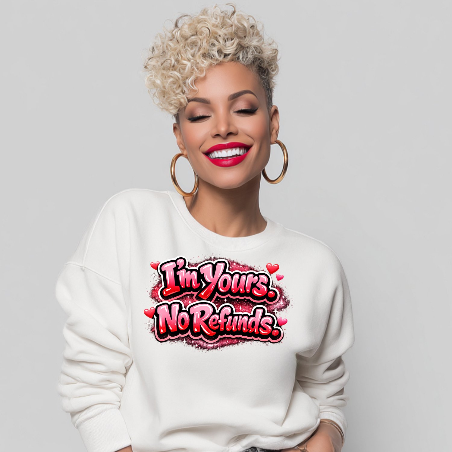This “I’m Yours. No Refunds.” design is perfect for Valentine’s Day, anniversaries, date nights, or anytime you want to make a playful love statement. The glossy pink lettering, hearts, and sparkle details give this design major rom-com energy with attitude.