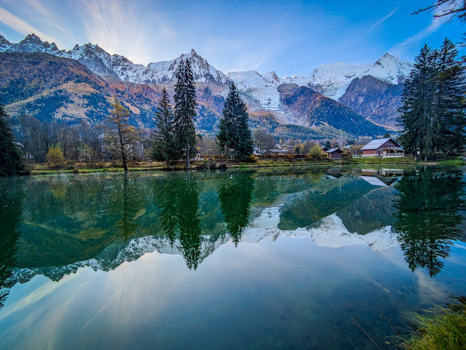 Taken in the early morning hours, this photograph shows Chamonix Valley reflected perfectly in still water as first light reaches the surrounding peaks. The mountains rise quietly above the trees, their forms mirrored below in near silence.