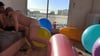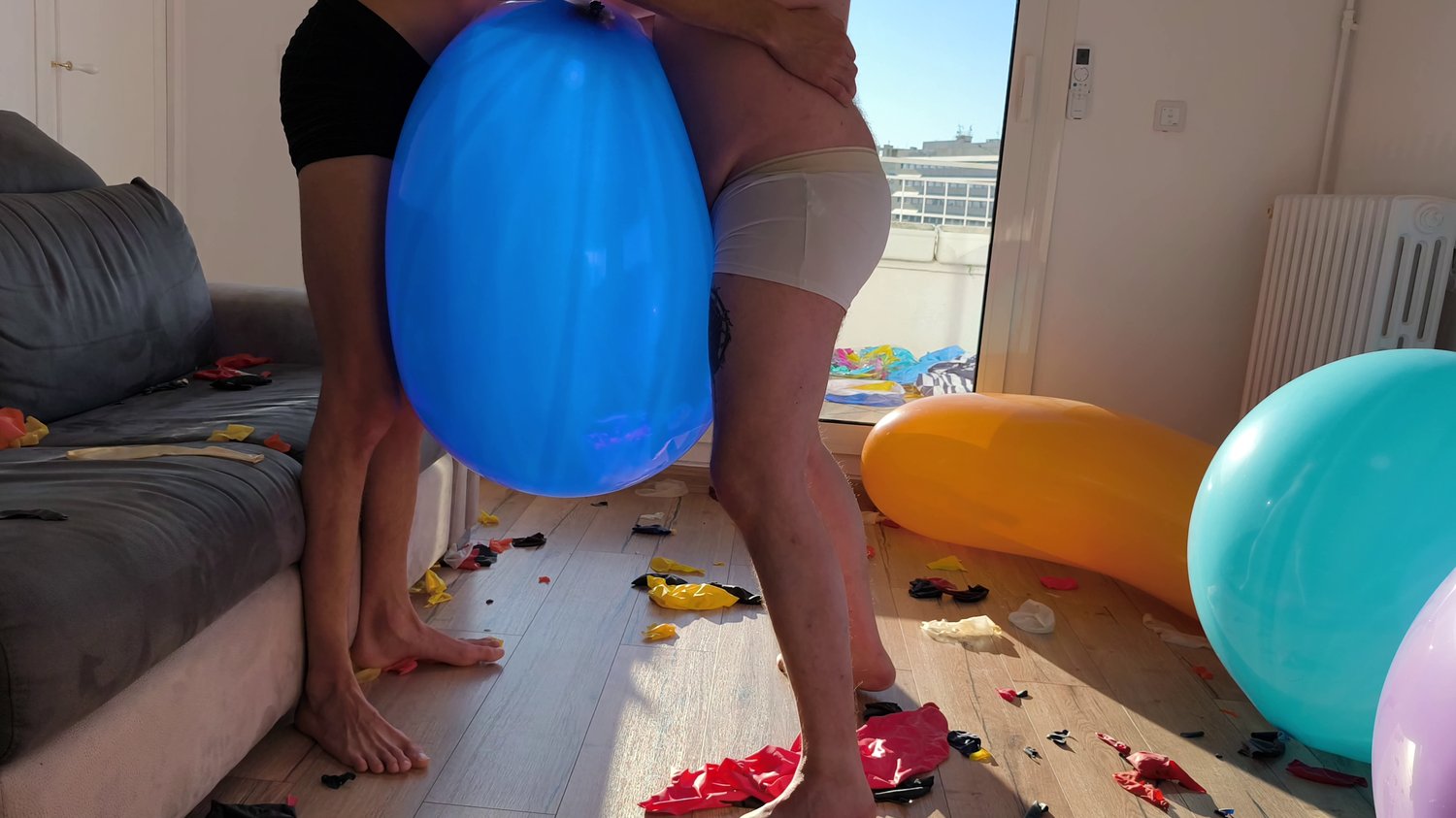 Charles and me burst giant balloons