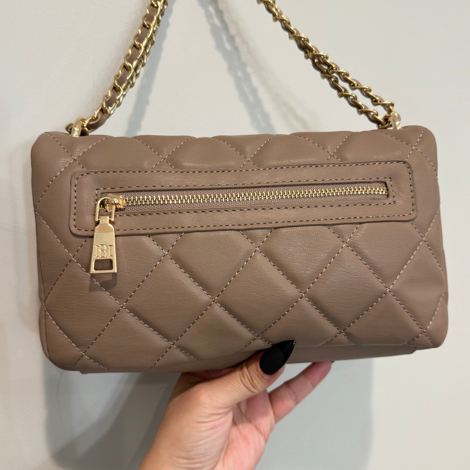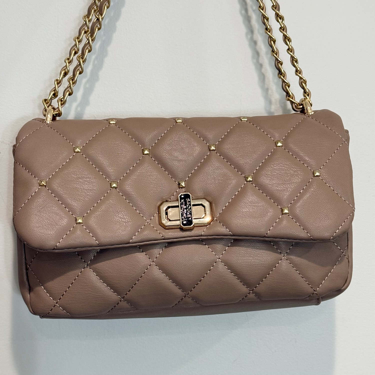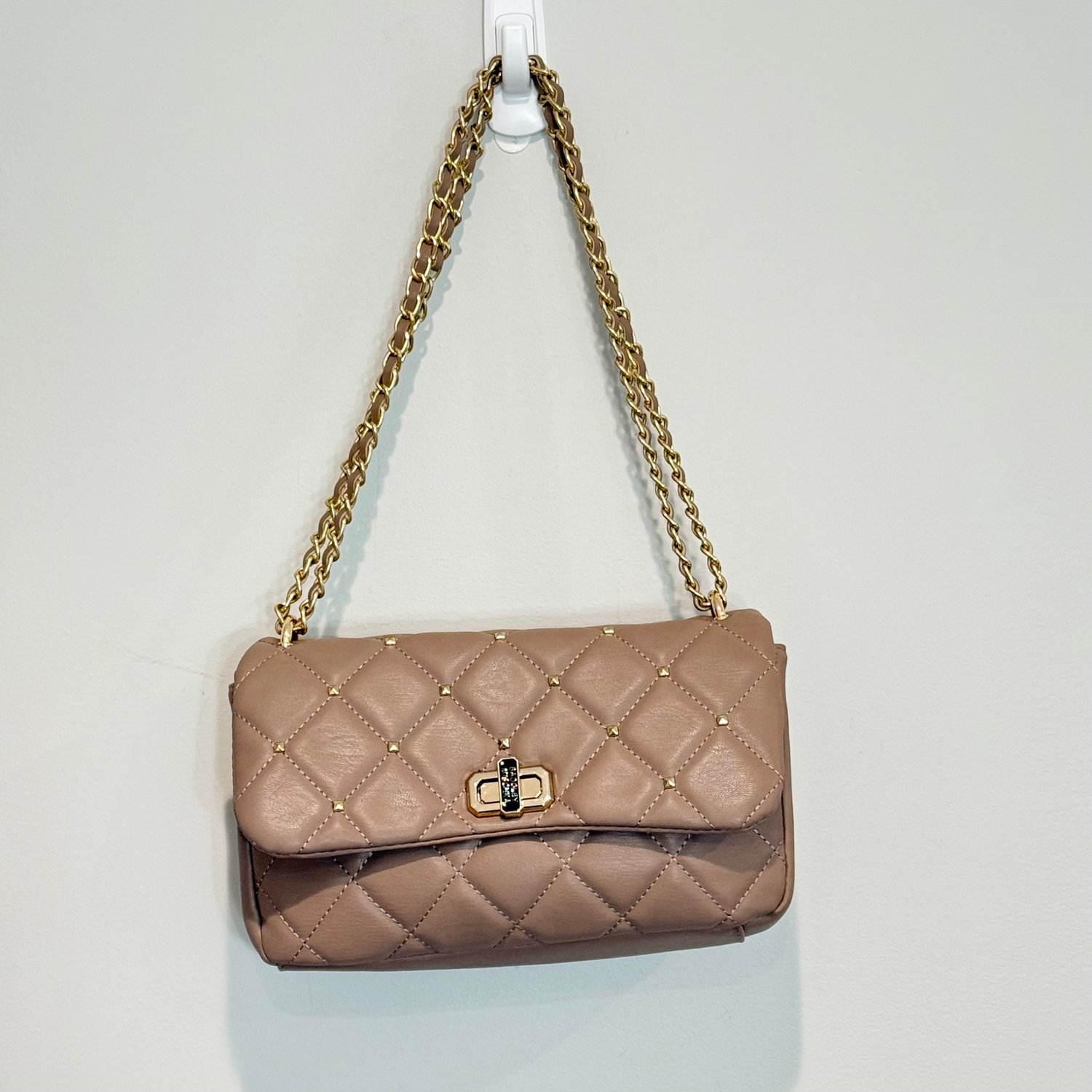 Badgley Mischka taupe-light brown quilted faux leather shoulder bag with gold tone hardware, chain detail in the strap, studs on the flap and a back zippered pocket. The strap is not removable but can be worn doubled for a shorter shoulder bag look or the strap can be worn singularly for a longer shoulder bag look. The turn lock on the flap closure has branding with black enamel. The interior has three sections, the back section has