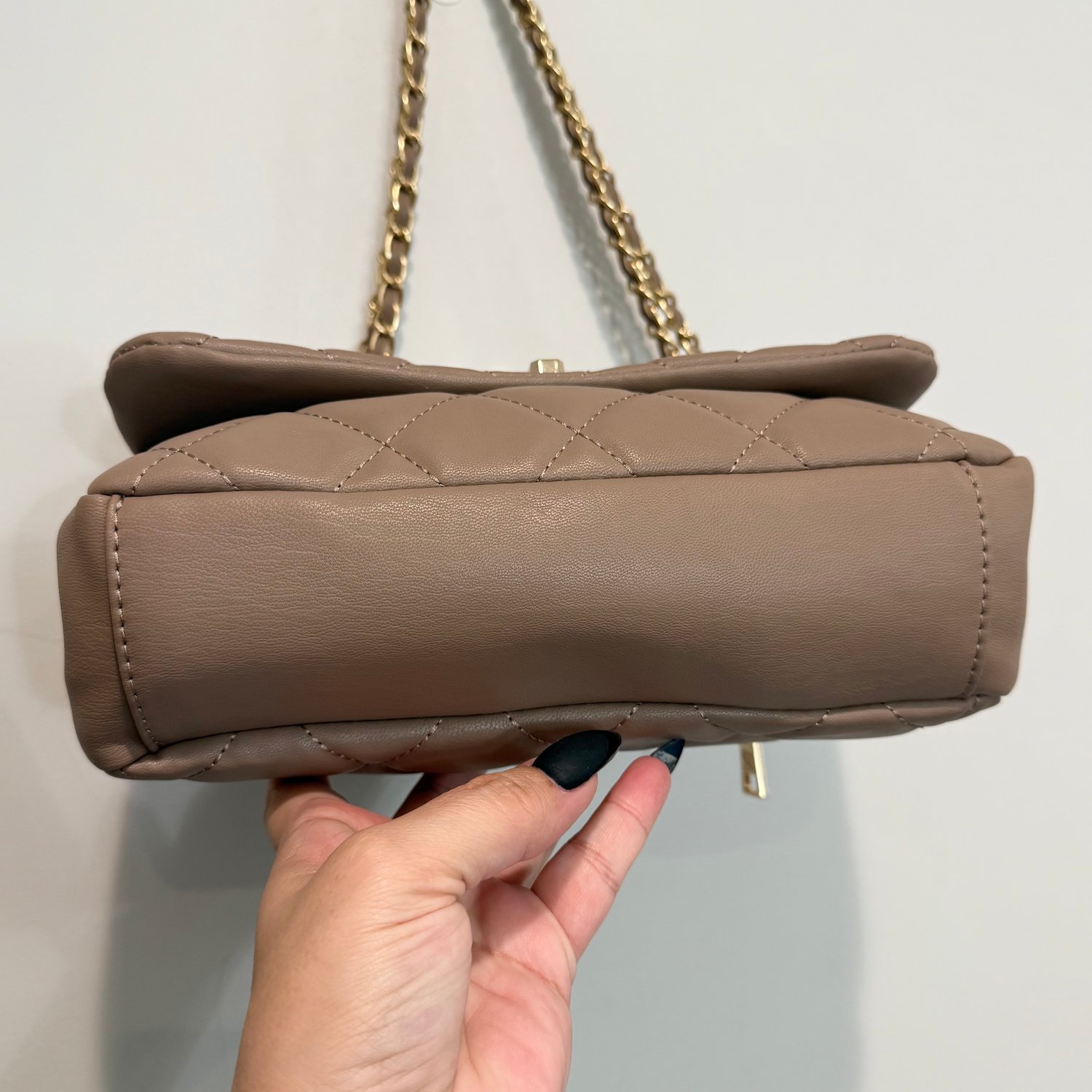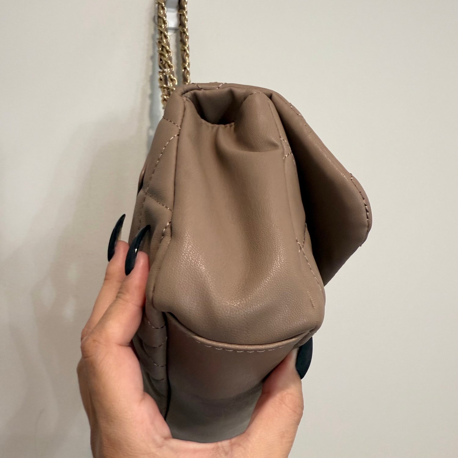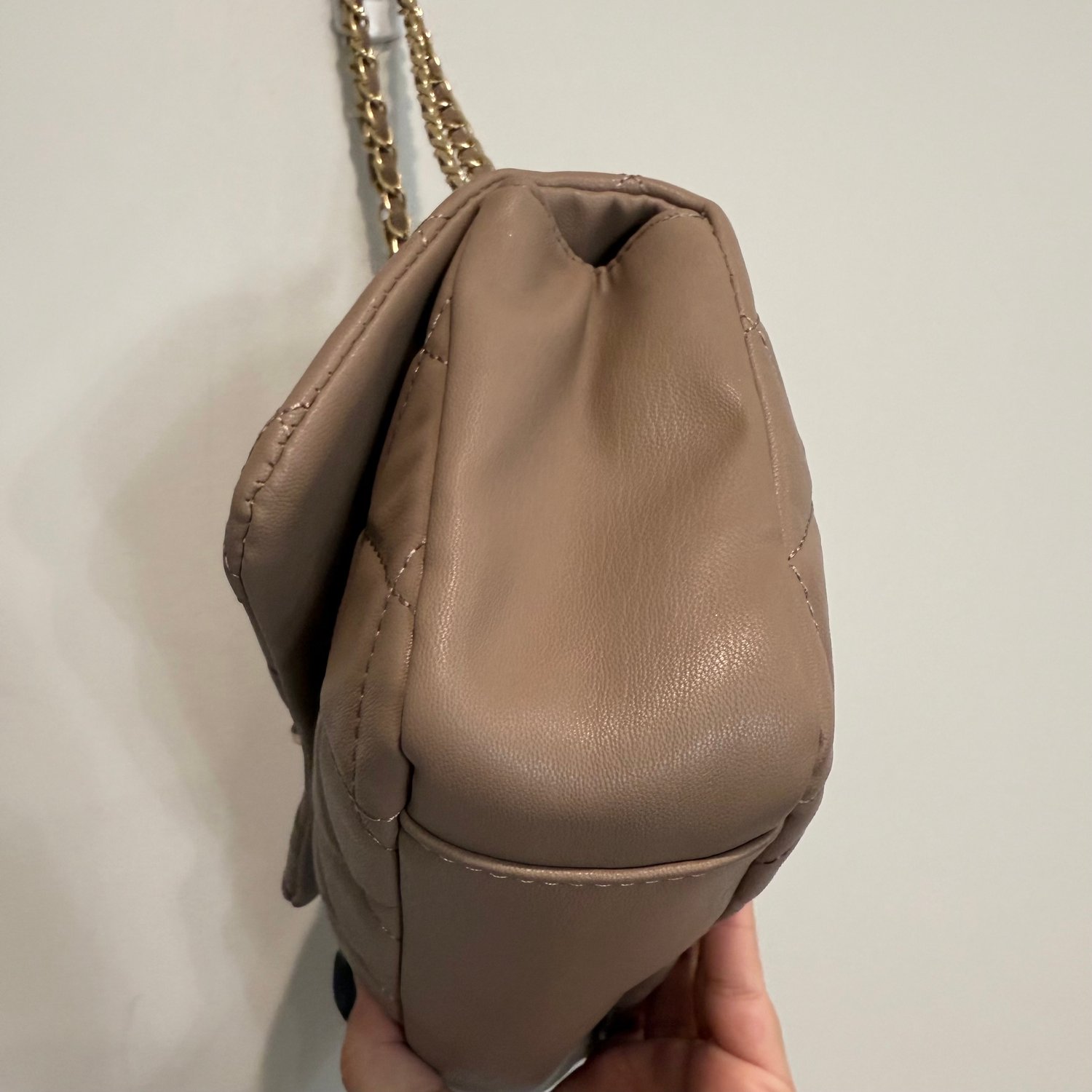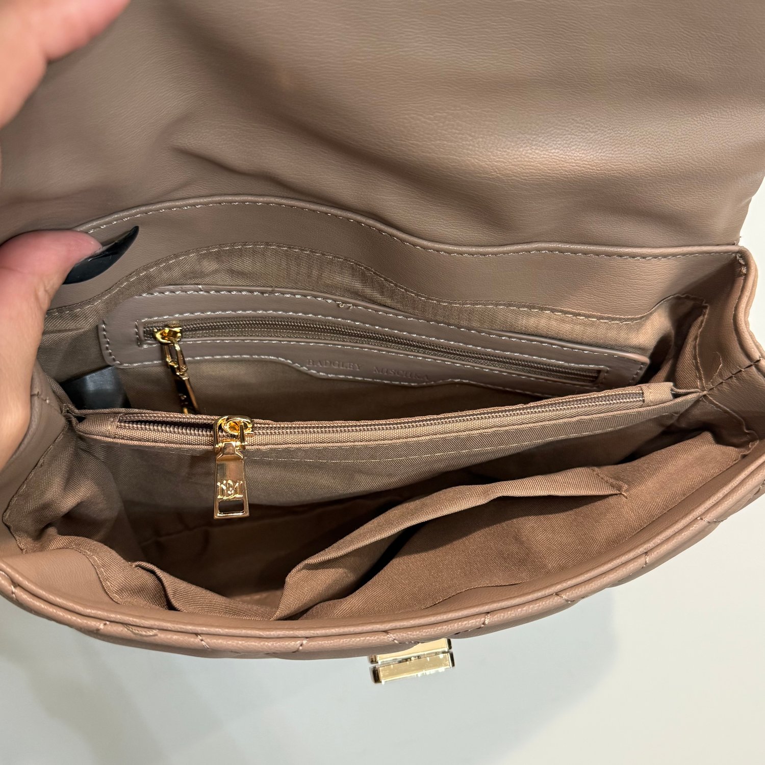 Badgley Mischka taupe-light brown quilted faux leather shoulder bag with gold tone hardware, chain detail in the strap, studs on the flap and a back zippered pocket. The strap is not removable but can be worn doubled for a shorter shoulder bag look or the strap can be worn singularly for a longer shoulder bag look. The turn lock on the flap closure has branding with black enamel. The interior has three sections, the back section has