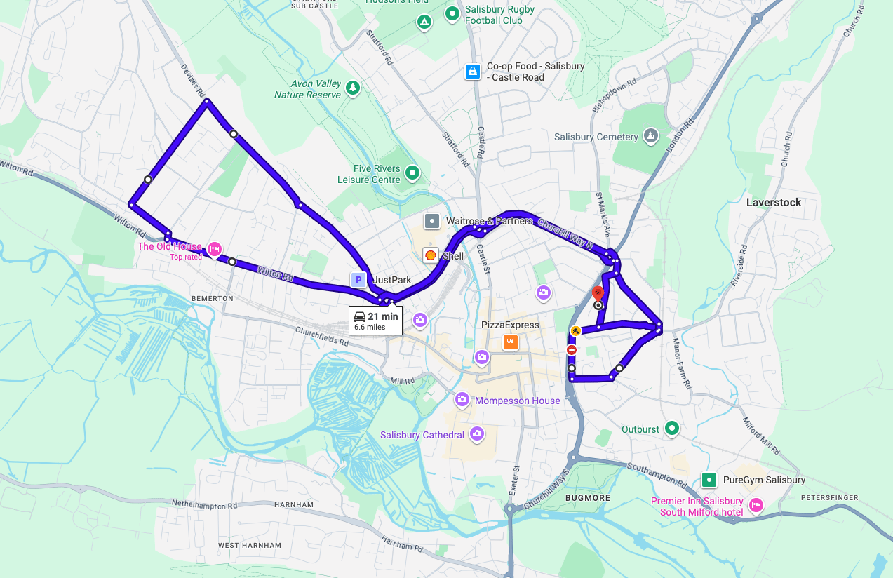 Practise real driving test routes in Salisbury before your exam – open directly in Google Maps