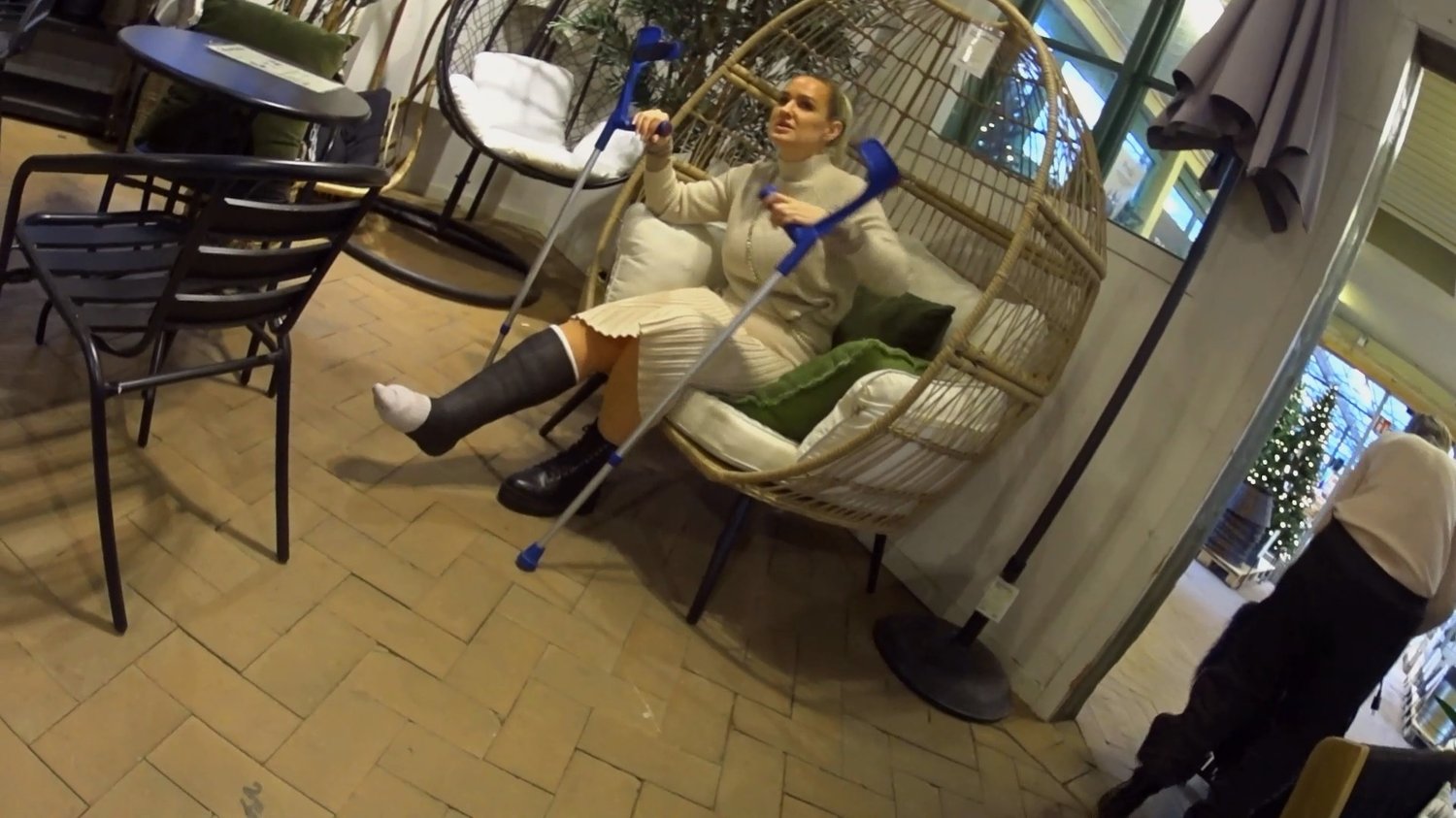 Ebba is in a store where she sits and rests in a hanging chair.Over her to her black short leg cast she has a white stocking.She gets up and we follow Ebba as she crutch around the store and looks at different things as she is slowly approaching the cash registers.
