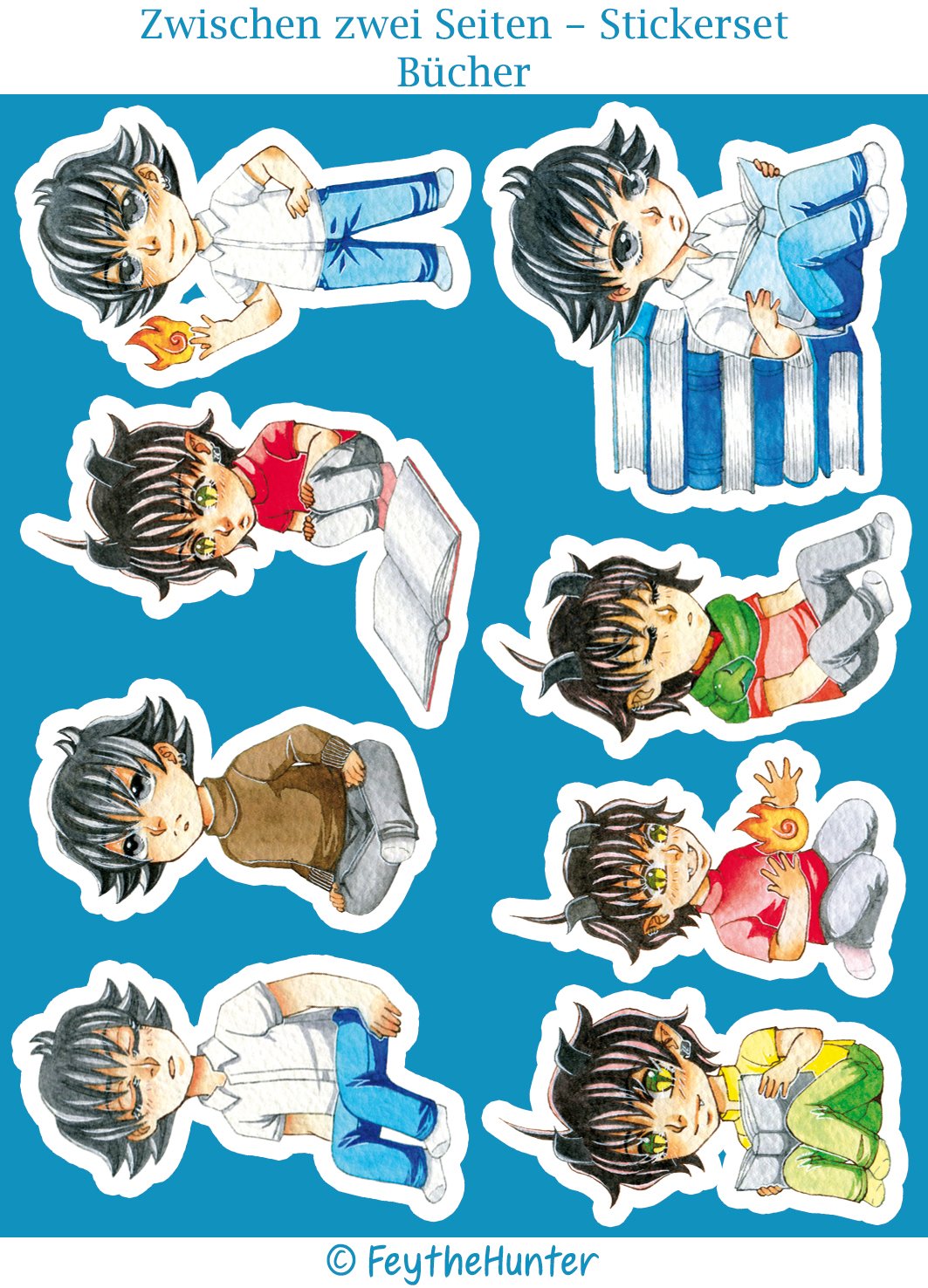 Ein süßer Stickerbogen mit Adrian und Lucas, den Hauptcharakteren aus "Zwischen zwei Seiten", mit einem Bücher-Thema. Die einzelnen Sticker sind vorgeschnitten und lassen sich leicht vom Bogen lösen.