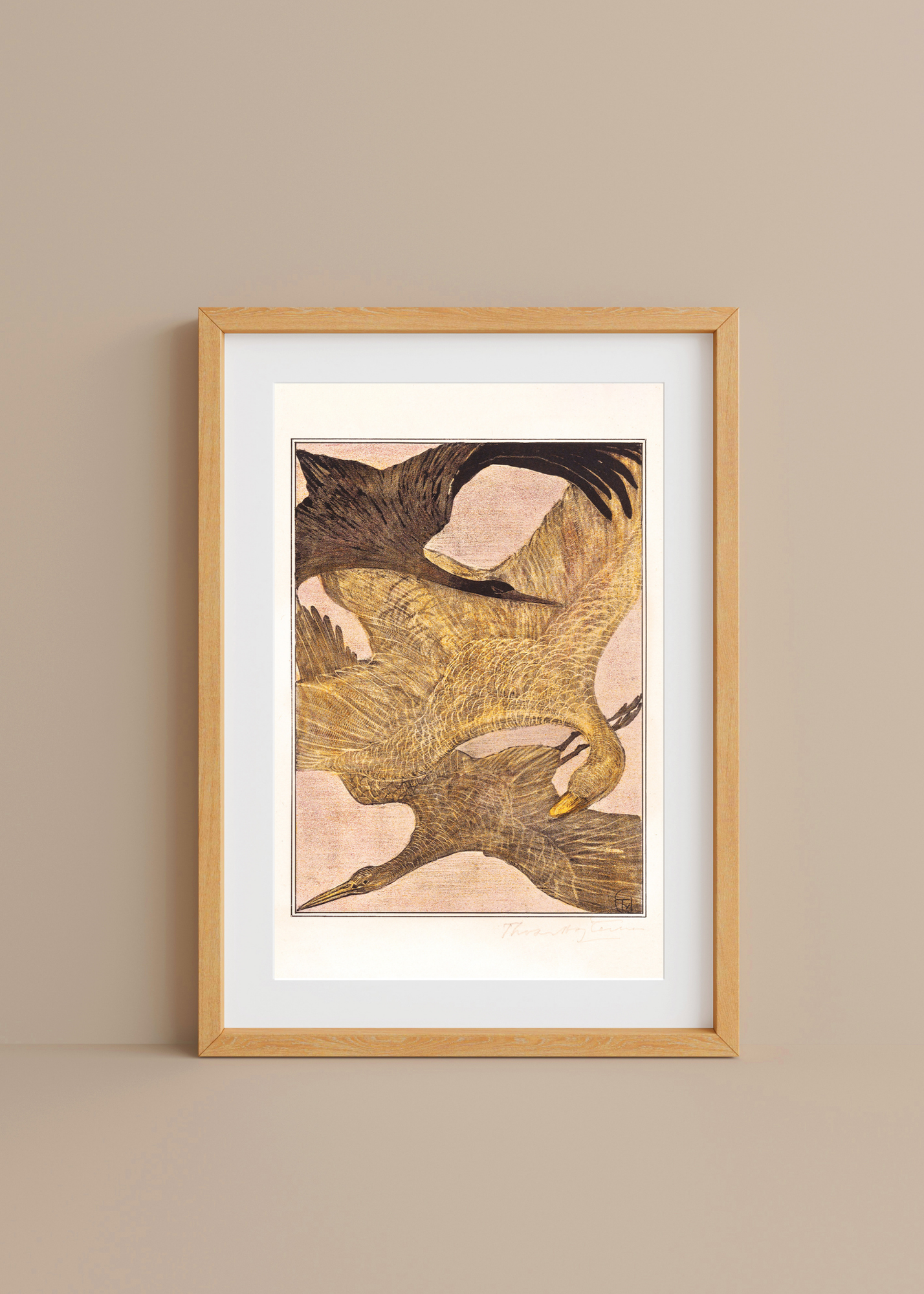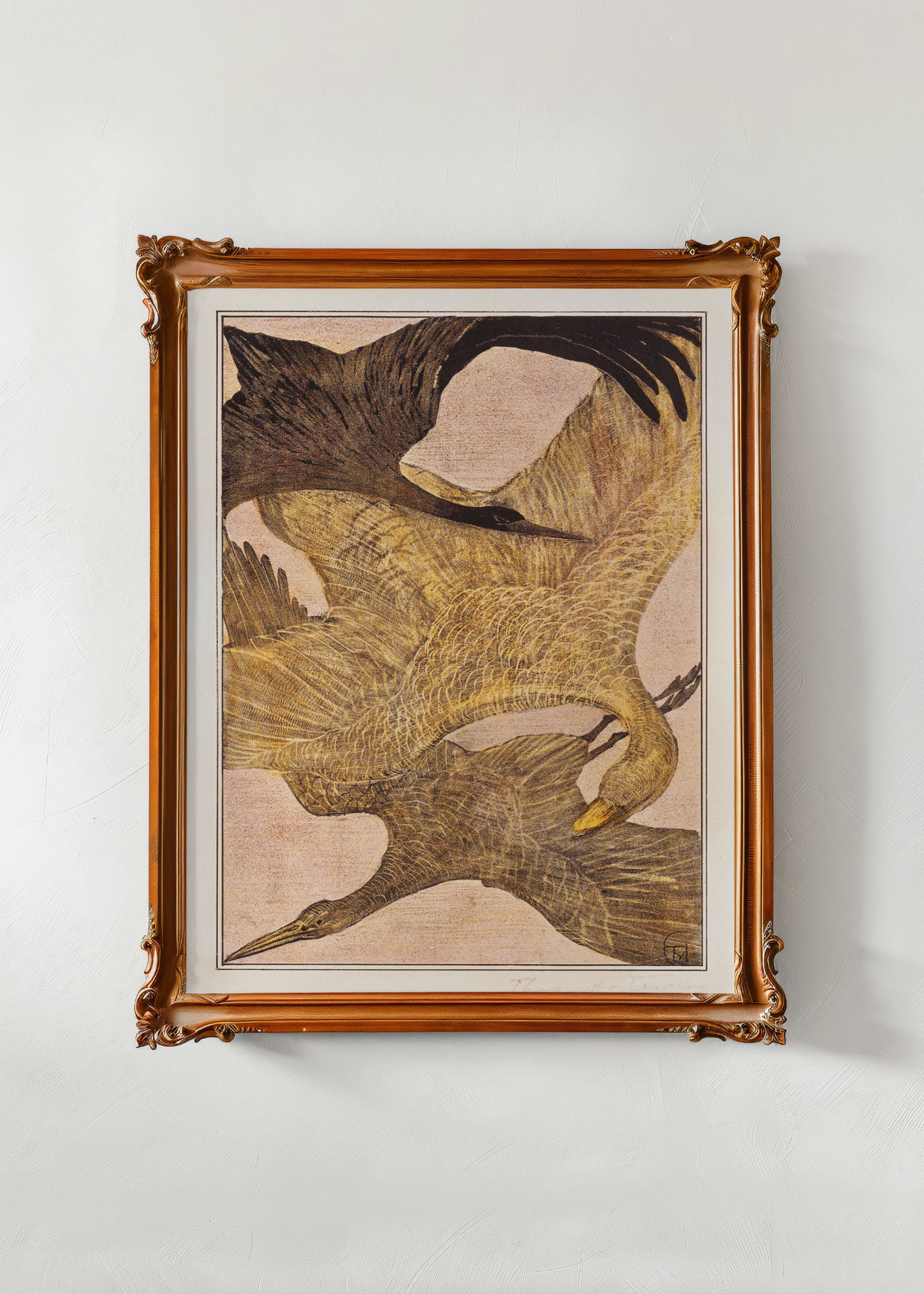 Three Flying Birds— Three silhouettes glide across an open sky, their wings outstretched in graceful rhythm. In Three Flying Birds, Theo Van Hoytema offers a quiet study in motion—elegant and free. The birds seem to drift between breath and breeze, a fleeting moment held still in ink and line. Light and tranquil, the composition whispers of open skies, shared paths, and the hush of early morning flight.