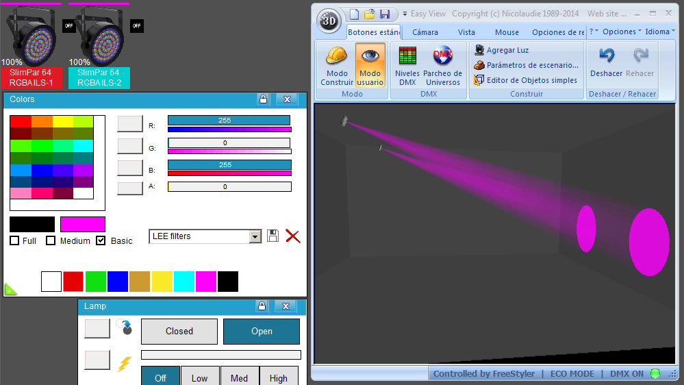 Esta Librería SSL2 está optimizada para trabajar con Magic 3d Easy View. Es decir para ver una representación 3D de las secuencias que estemos realizando con Freestyler, QLC+ o cualquier otro soft que se conecte con Magic 3d.