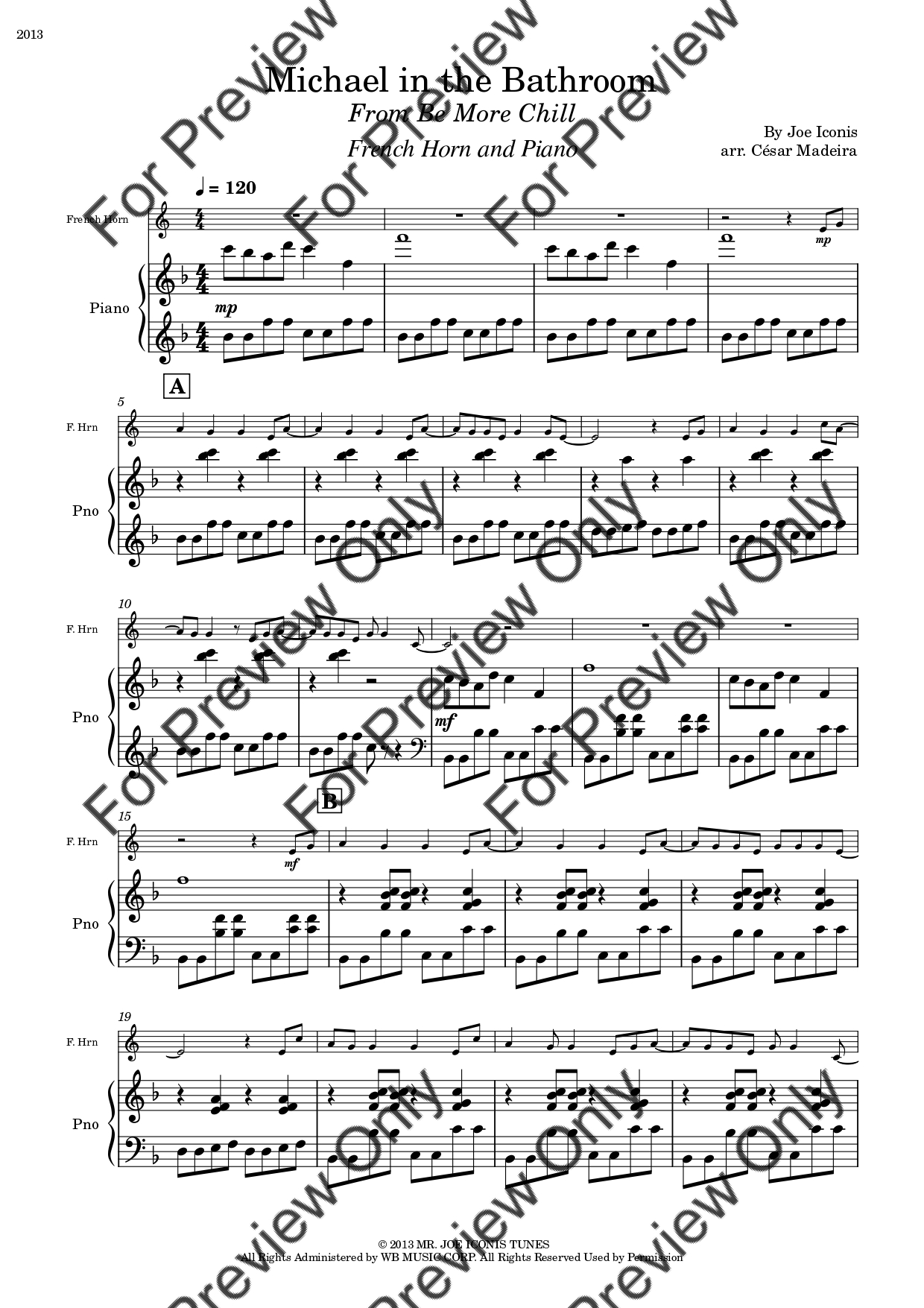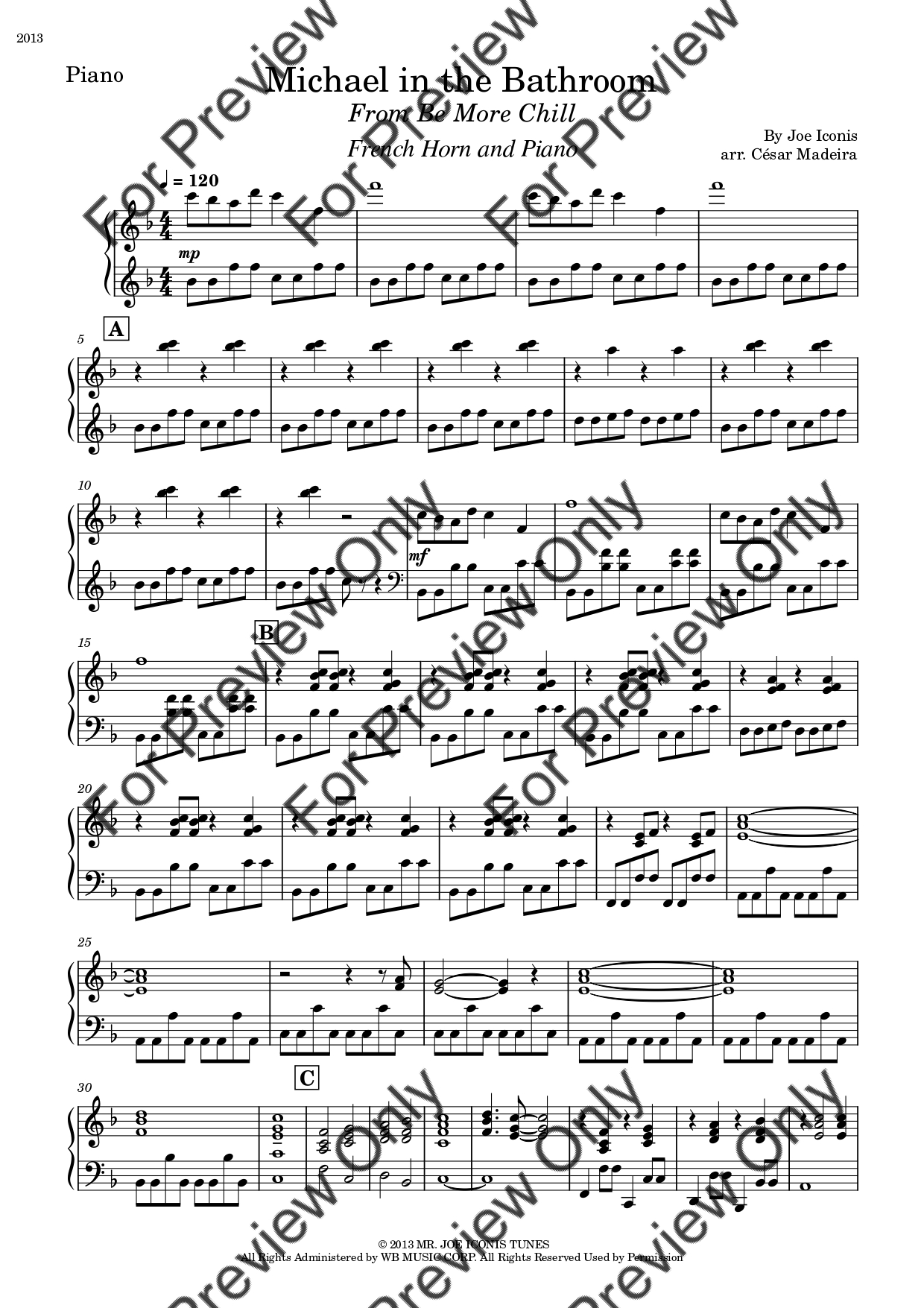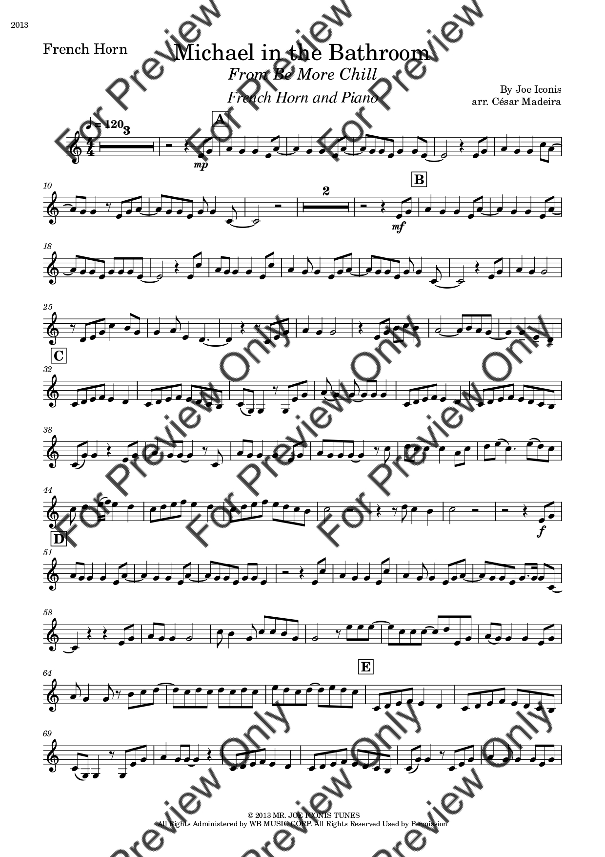 Michael In The Bathroom from Be More Chill by Joe Iconis. Arrangement for French Horn and Piano. With Full Score and Individual Parts. Have fun!