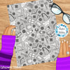 Fantasy game icons, including polyhedral dice, weapons, treasures and maps.