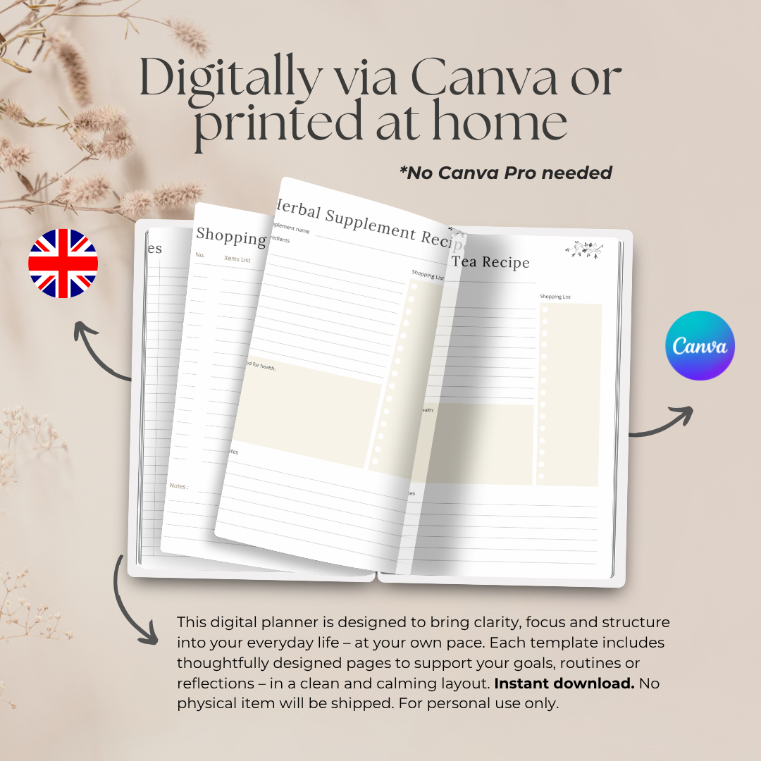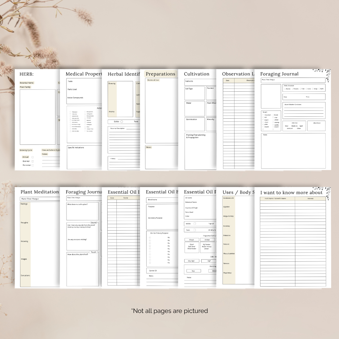 This 21-page Herbs & Essential Oils Journal is your mindful space to explore the healing world of plants. Whether you're growing herbs, blending essential oils, foraging in the wild, or creating your own herbal apothecary – this journal gives you structure, inspiration, and depth for every step of your journey.