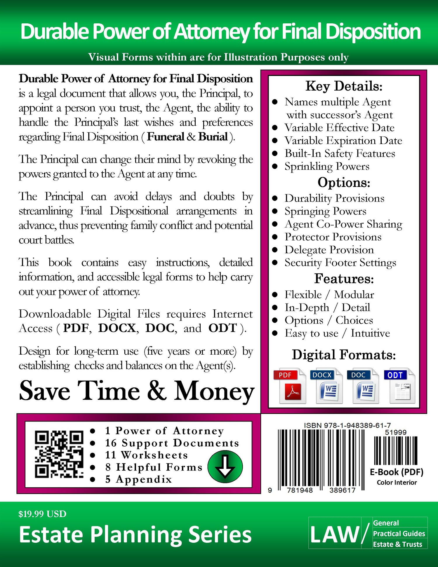 The book consists of (01) one Durable Power of Attorney (Final Disposition), (16) sixteen Supporting Documents, (11) eleven Worksheets, (05) five Miscellaneous Forms, (03) three Recommended Forms, and (05) five Appendix. This Power of Attorney has an estate planning focus that provides options, depth, and flexibility while maintaining uniformity with built-in and optional safety features.