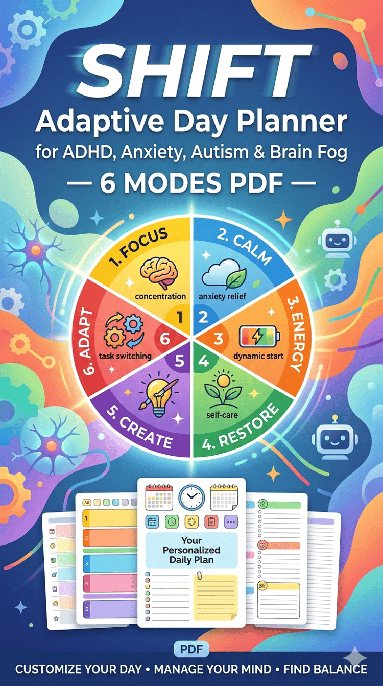 SHIFT — The Adaptive Day Planner ($12 value) A printable day planner with six modes — because your brain is not the same every day and your planner should not pretend it is. Every morning you choose: High Energy, ADHD, Low Energy, Anxiety, Autism, or Brain Fog. Each mode gives you a completely different structure designed for exactly that state of mind. Undated. Print unlimited times. Works digitally on GoodNotes, Notability, or Xodo.