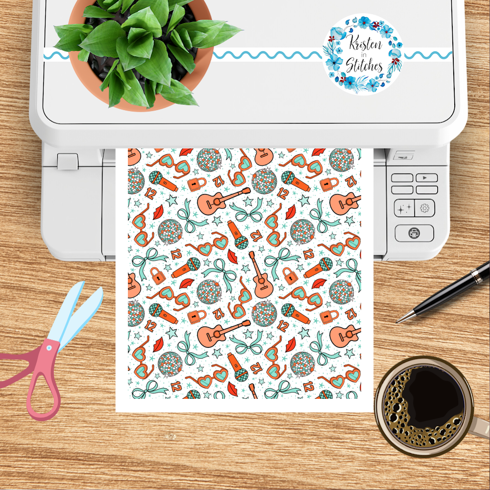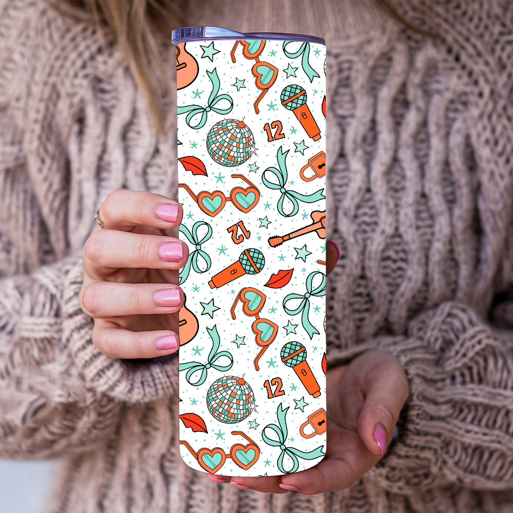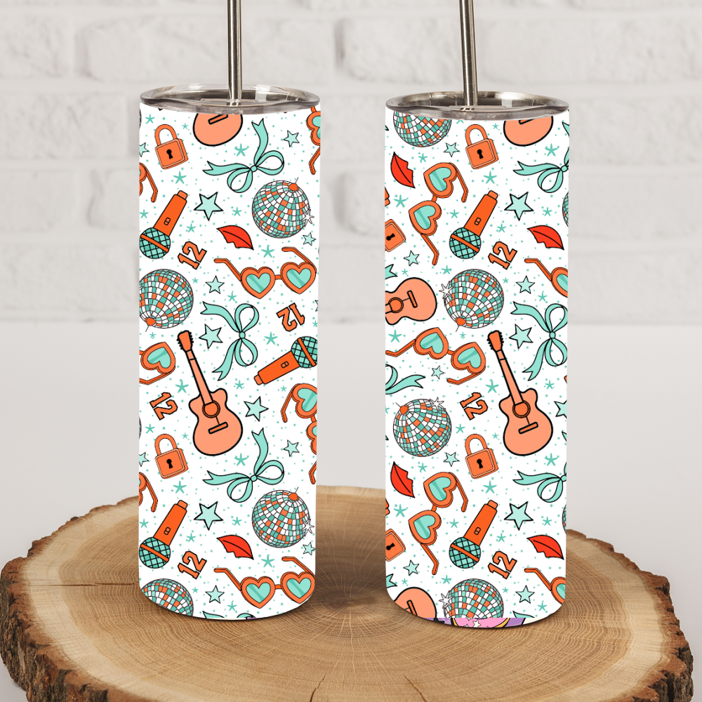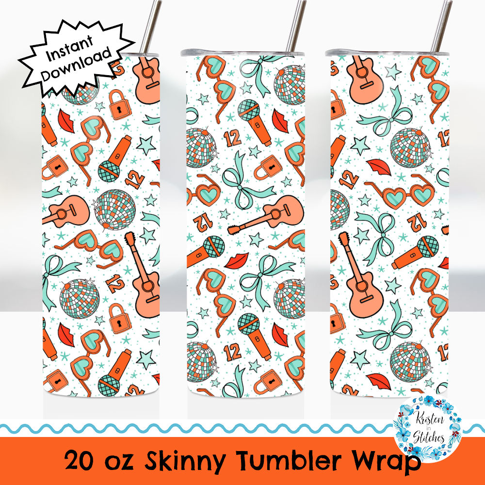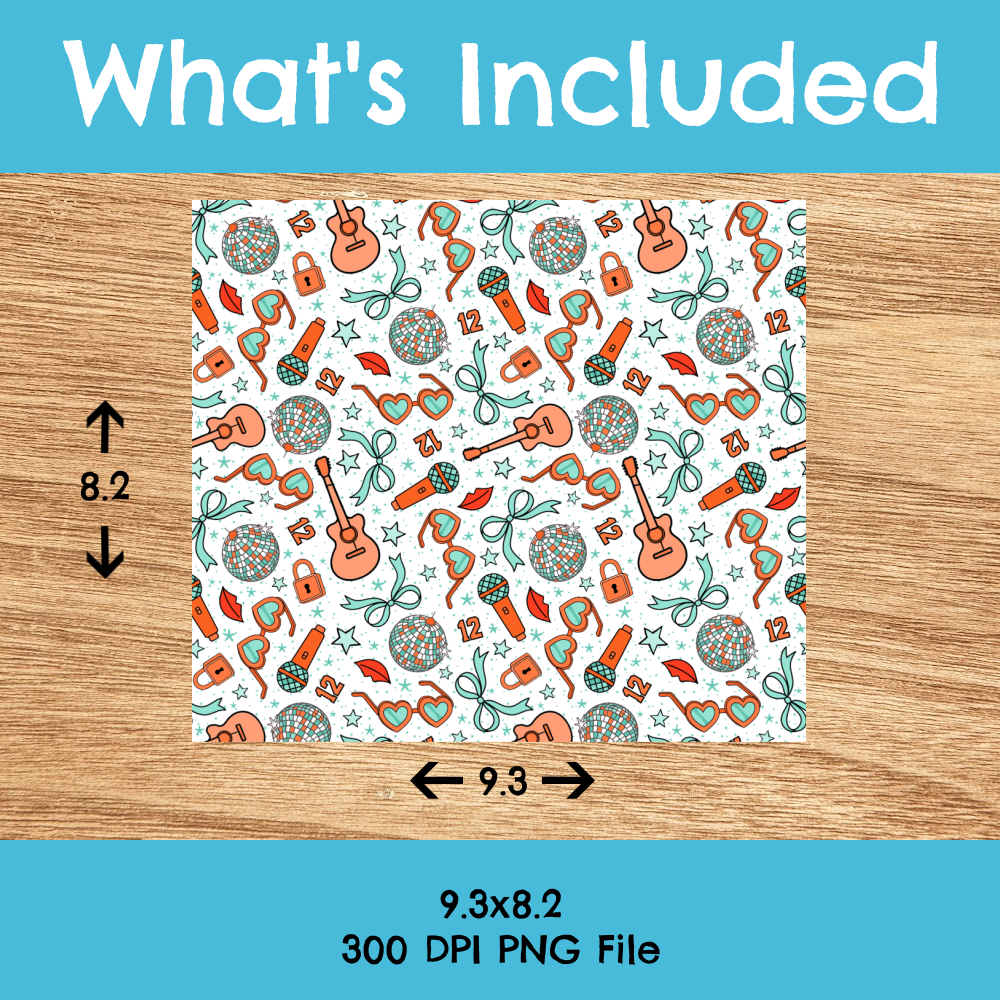 The pattern features icons in orange and mint representing the Life of a Show Girl album. Perfect for a Taylor fan!