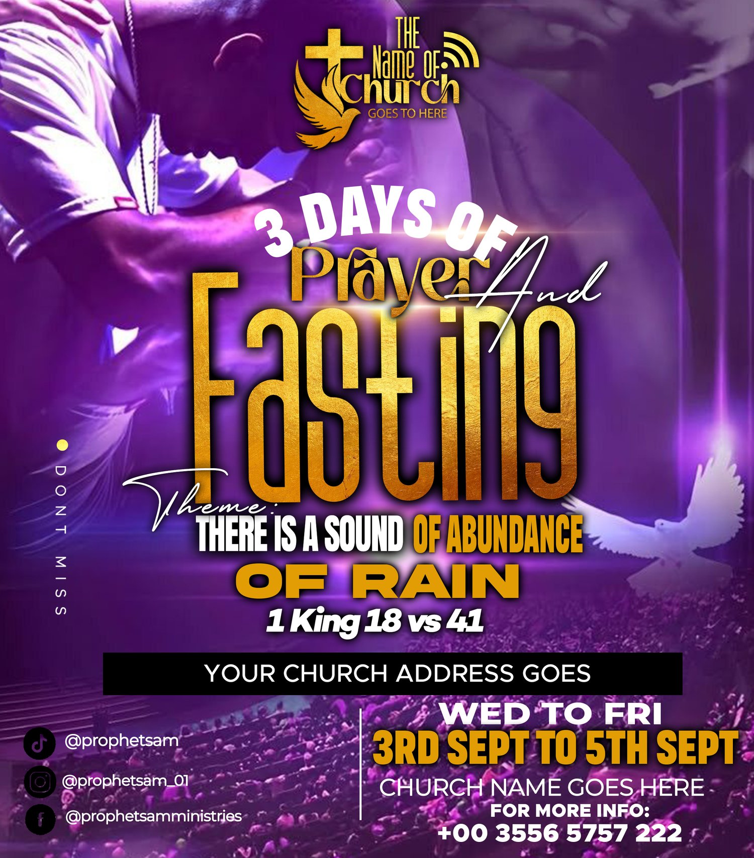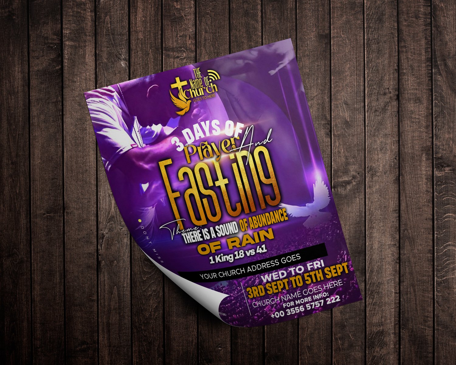 The attached image is a vibrant church event poster designed to promote a “3 Days of Prayer and Fasting” program.