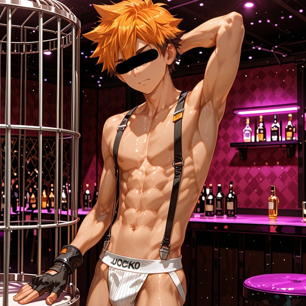 男性ショーダンサーをテーマに、ジョックストラップとサスペンダーを着せて、ポールと鳥かごをテーマに、キャラクターの魅力を存分に表現しました。