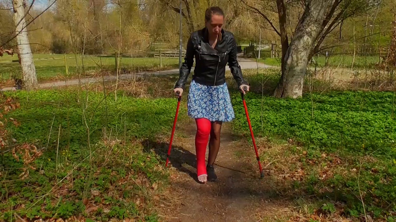 Sunshine comes crutching casted in a red LLC and tells us about how she broke her right leg again, that it will take another 6 months until she can walk on it again. She turns around and says that it doesn’t hurt anymore and that she’s good with the crutches now. We then decided to visit the park, unfortunately there’s going to be stairs but Sunshine didn’t mind. She later crutched around at the park in peace and enjoyed the fresh air, she even managed to pick a flower with the toes of her casted foot. Of course there’s closeups too.