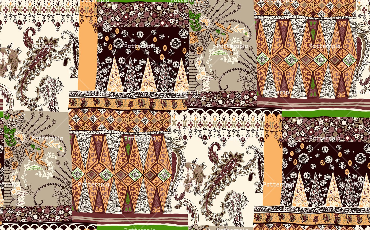 Paisley, floral & geometric patchwork in brown, beige, orange & green