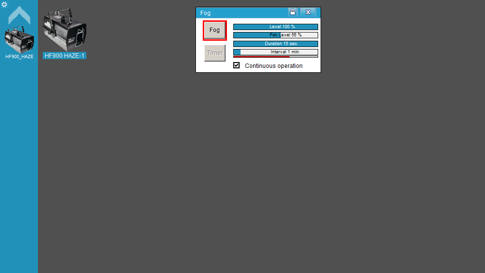 • Con el Botón de “Fog” dispara Haze mientras que esté presionado. Al soltar apaga. Si activa el box de “Continuos Operation” queda apretado el botón por lo que largará niebla hasta que lo vuelva a presionar.
