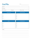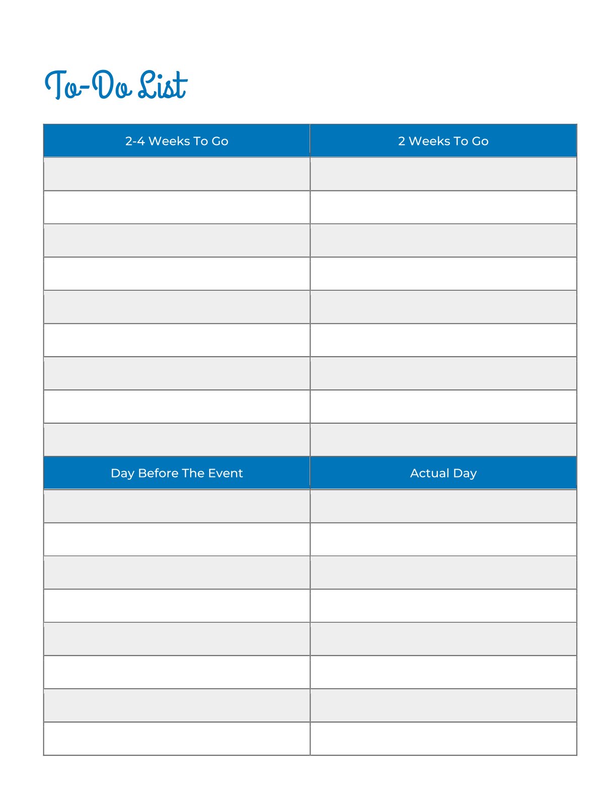 A practical event countdown layout with sections for 2–4 weeks to go, 2 weeks to go, the day before the event, and the actual day, plus a to-do list to map tasks, vendor follow-ups, setup and cleanup. This helps you execute smoothly and reduce last-minute stress.