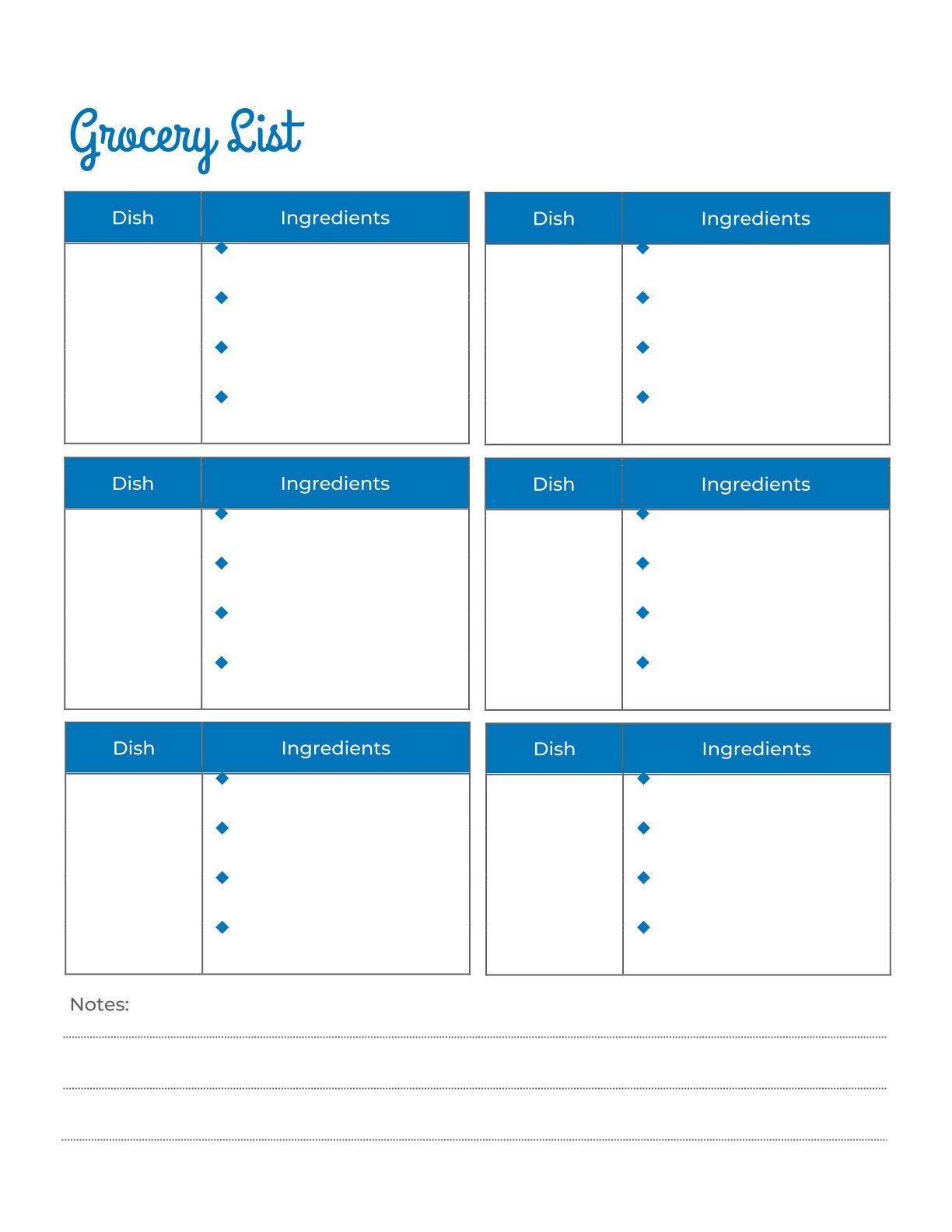 Dedicated grocery list area plus extra notes space so you can convert your menu and supplies into a clear shopping plan without missing essentials.