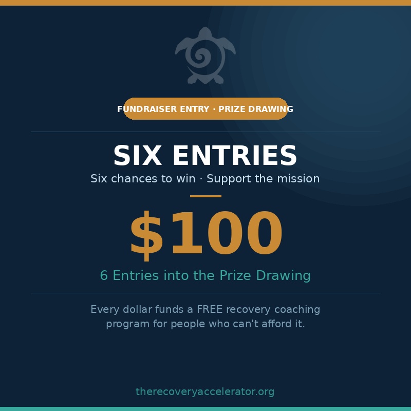 Your $100 gets you six entries into The Recovery Accelerator Prize Drawing — a 50/50 fundraiser supporting a free 16-week coaching program for people in recovery who can't afford it.