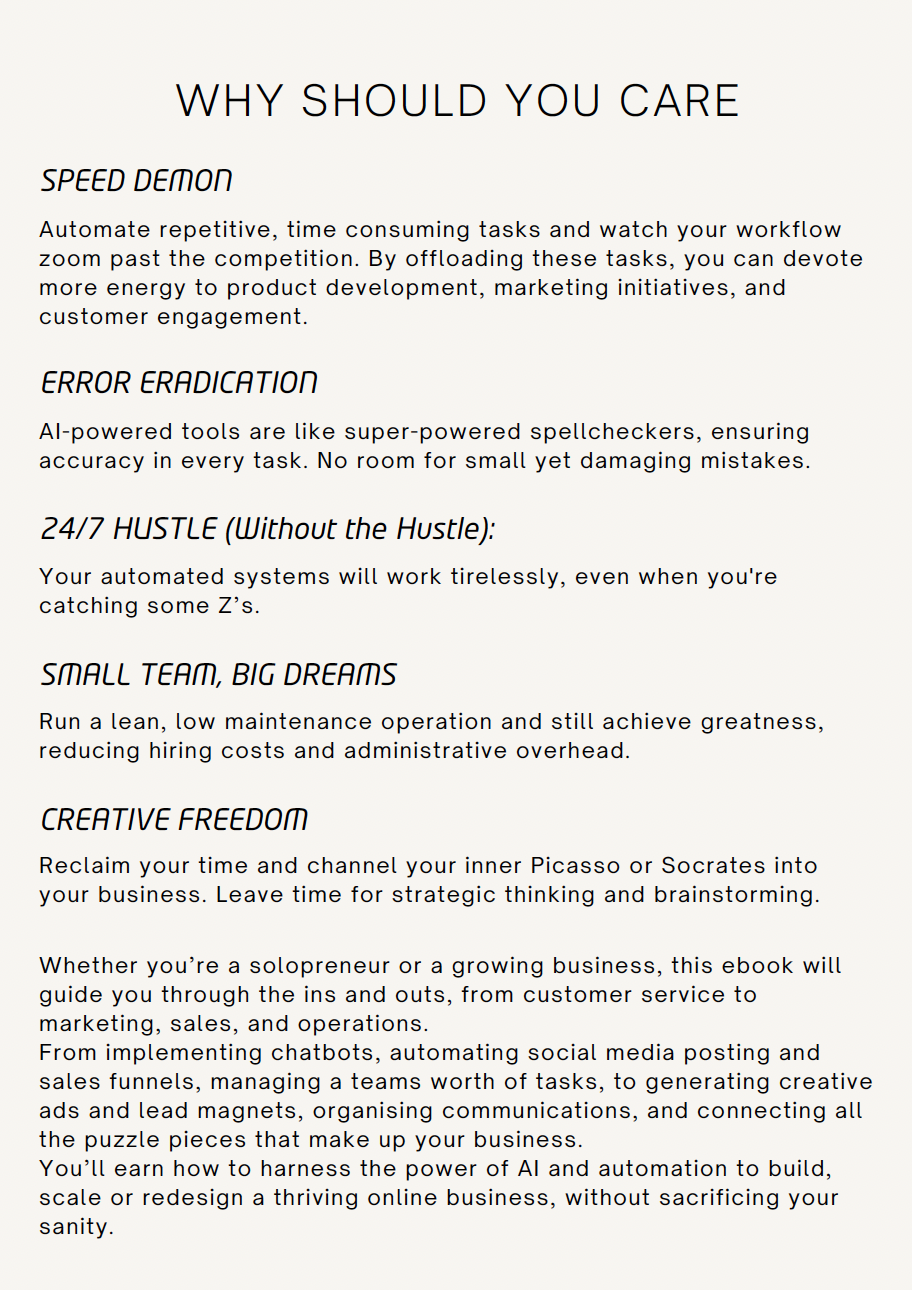 The secret sauce to running a killer online business? It’s all about letting automation and AI do the heavy lifting. These tools slash you time, cut down costs, and help you run lean with a small, efficient team. Automation handles repetitive tasks, freeing up your creativity for strategic decisions. And AI? It’s like having a genius sidekick; analysing data, predicting trends, and personalising customer experiences to keep you ahead of the game. Together, they create a streamlined, scalable system that’s not only efficient but also makes running a business feel a whole lot more fun and manageable.