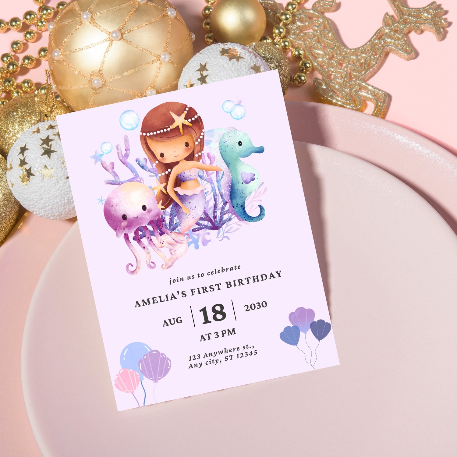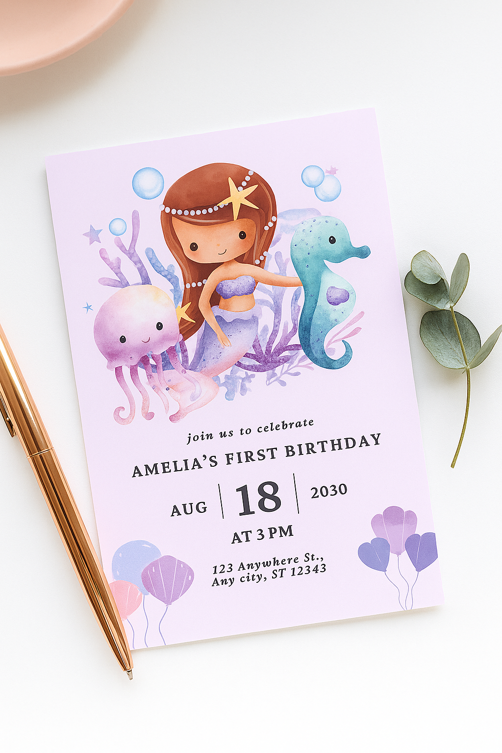 Whether you’re hosting a mermaid first birthday or an under the sea adventure, this template makes party planning stress-free and fun. Just edit, download, and print at home or with a local print shop!