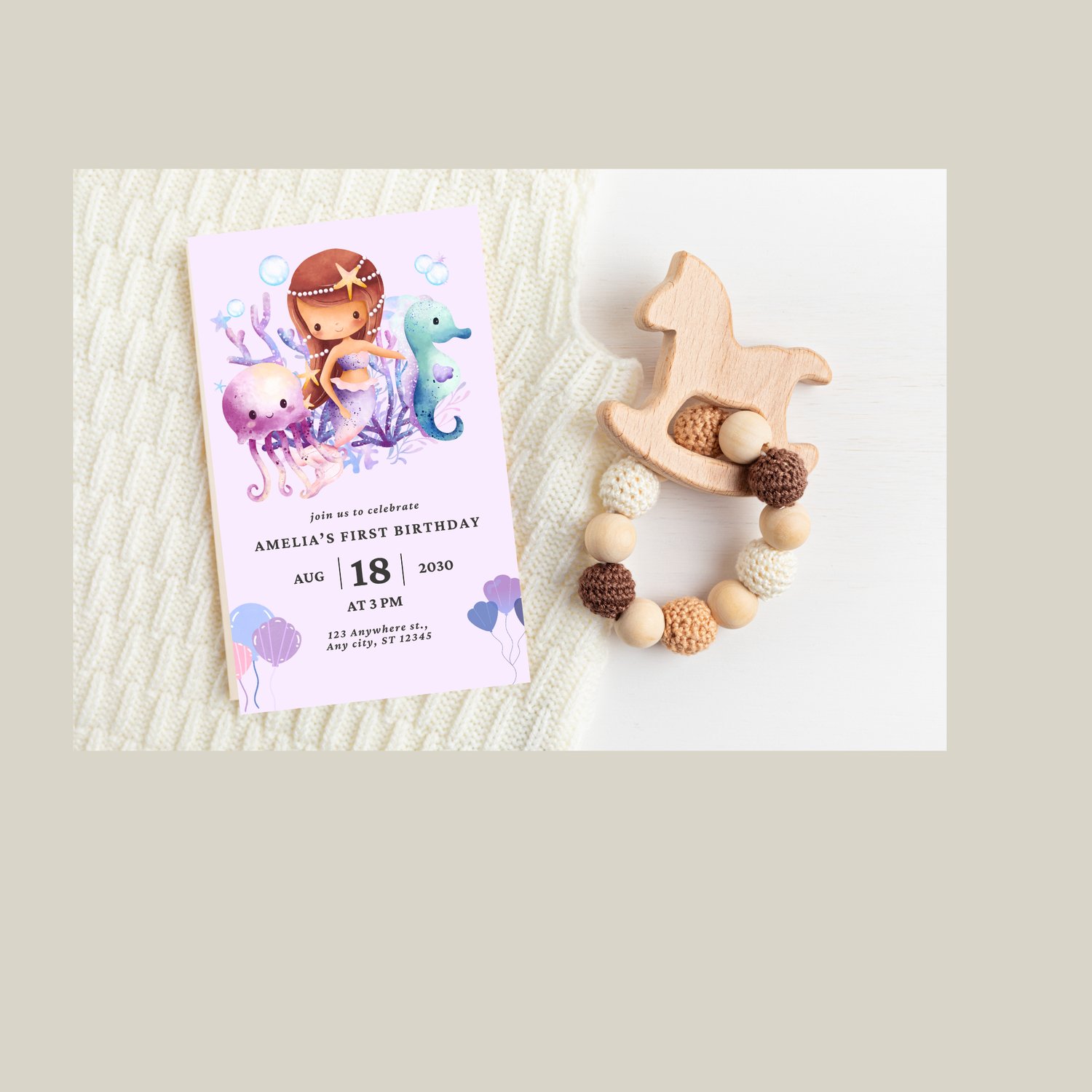 Make your little girl’s special day magical with this Mermaid Birthday Invitation Template! Featuring adorable watercolor mermaid, seahorse, and jellyfish illustrations, this under the sea party invite is perfect for first birthdays, toddler parties, and ocean-themed celebrations.