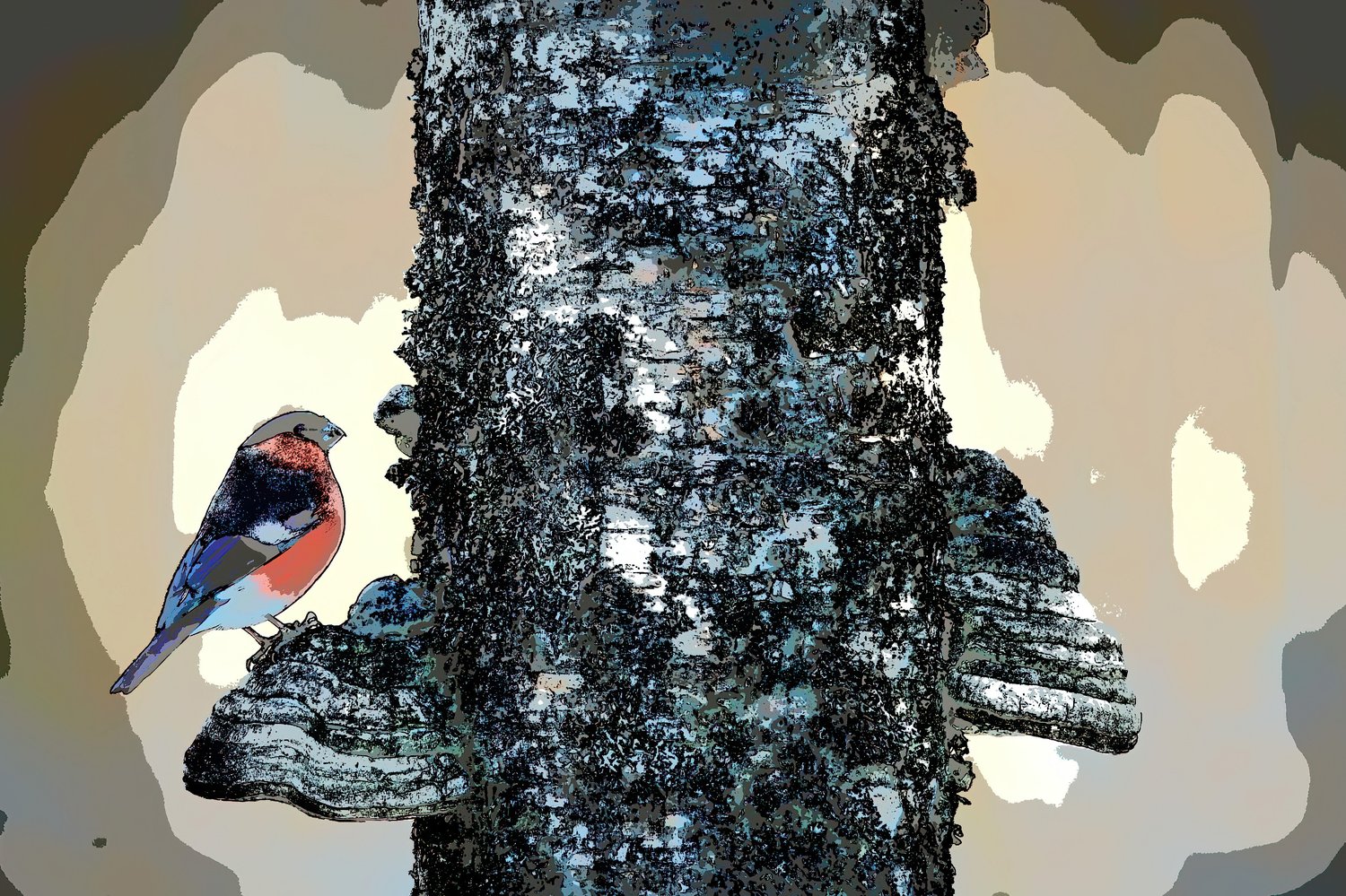 Bullfinch male (Pyrrhula pyrrhula) sitting on hoof fungus