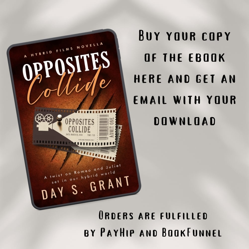 Opposites Collide takes place in the same world as The Mavens series but can be read as a standalone. The Hybrid Films series focuses on in-world movies; this movie’s rating is PG-13 (so don’t expect a lot of steam).