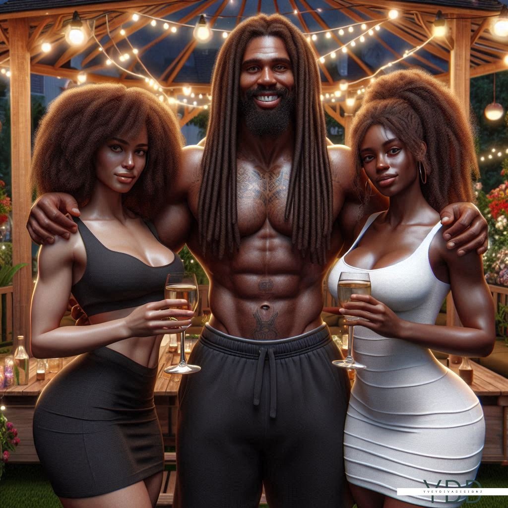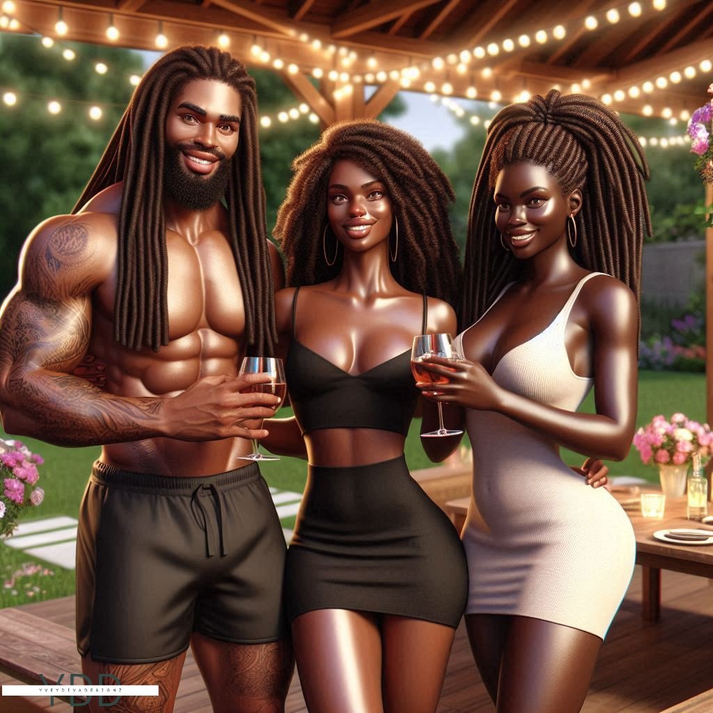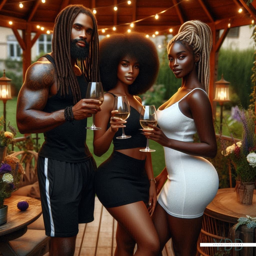 In a serene backyard gazebo, African American couples and throuples embrace the joy of community. Sipping wine, laughing, and engaging in playful conversations. They celebrate the beauty of love, friendship, and shared moments under the soft glow of the evening sky, celebrating the beauty of connection and companionship.
