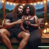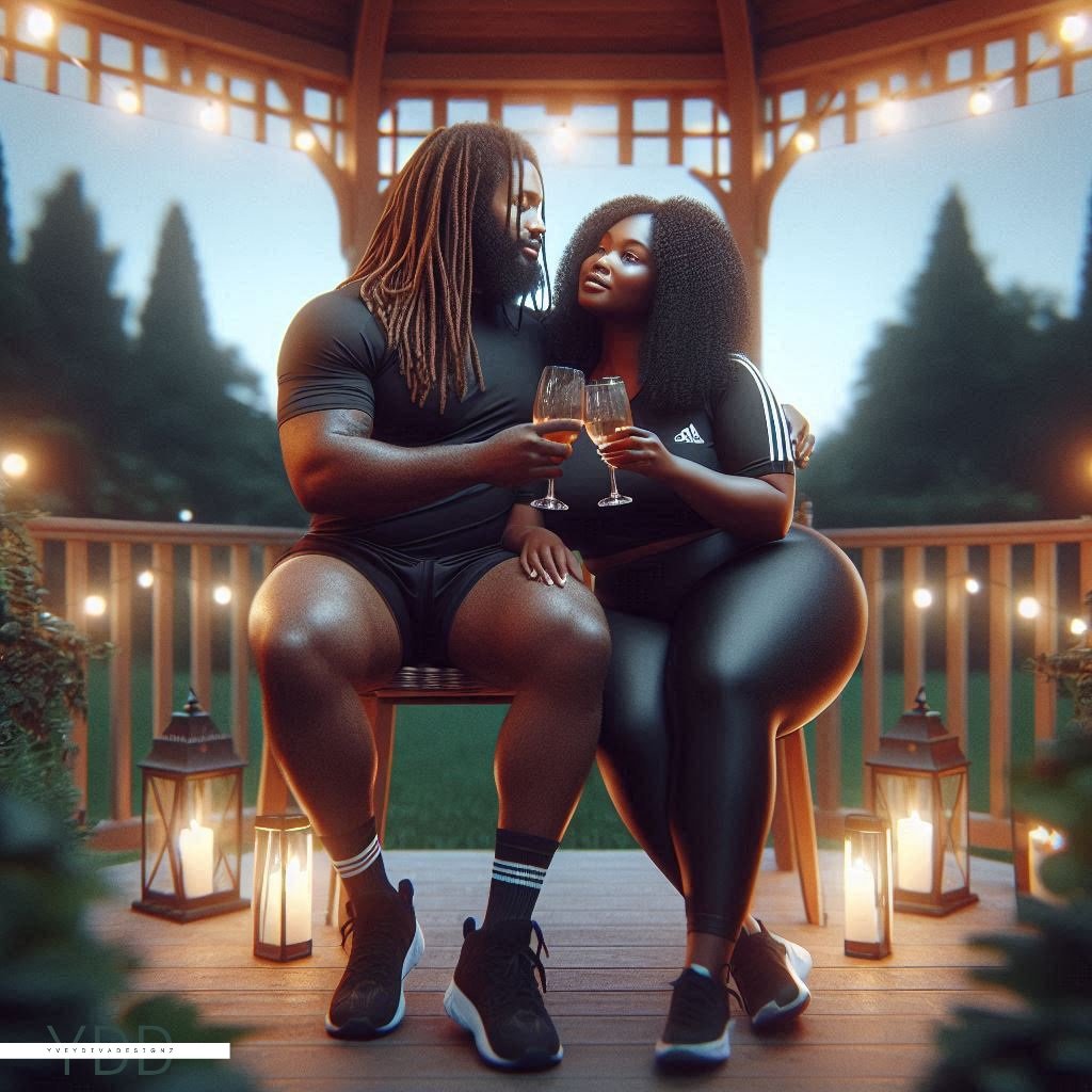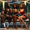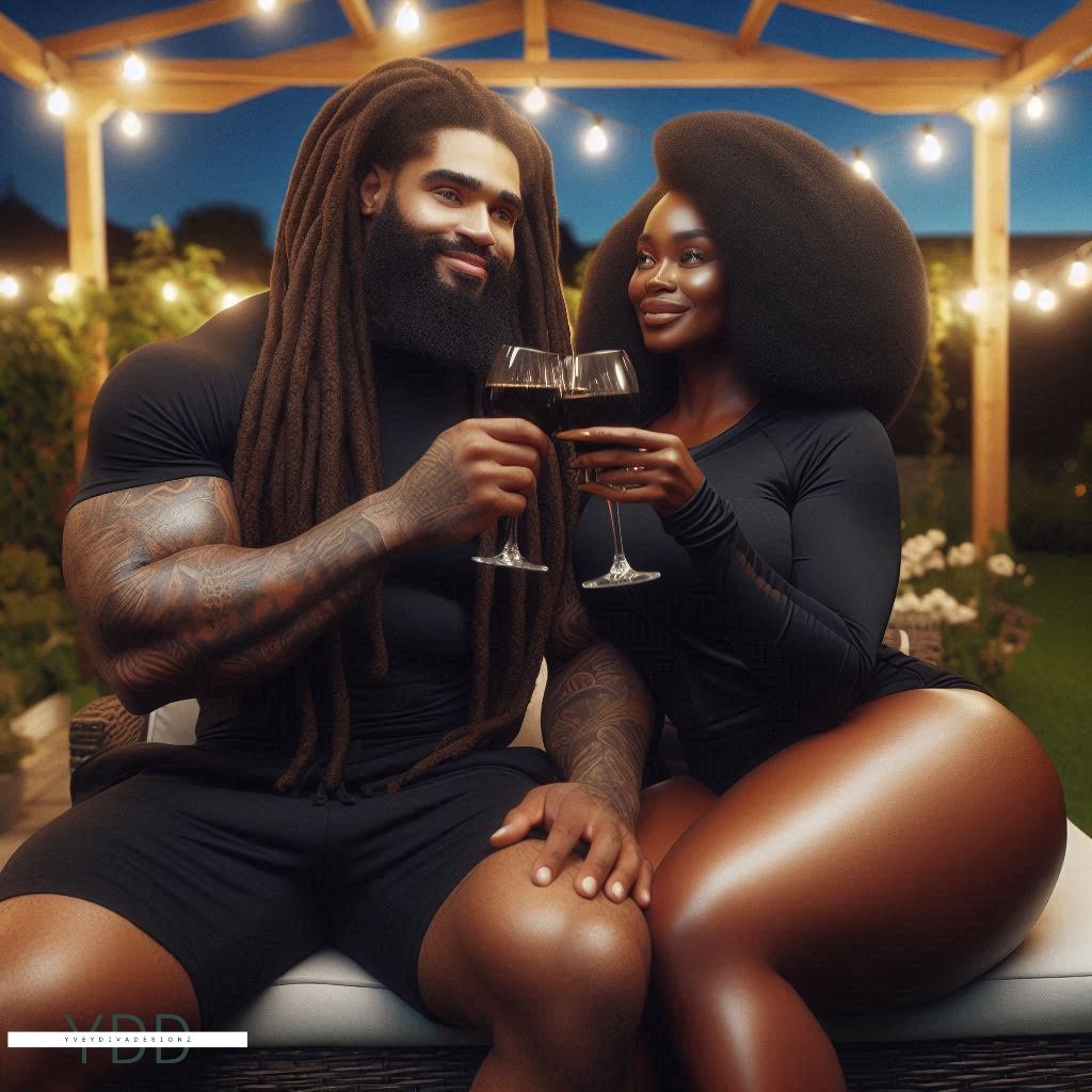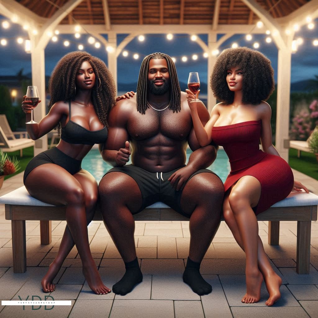 In a serene backyard gazebo, African American couples and throuples embrace the joy of community. Sipping wine, laughing, and engaging in playful conversations. They celebrate the beauty of love, friendship, and shared moments under the soft glow of the evening sky, celebrating the beauty of connection and companionship.
