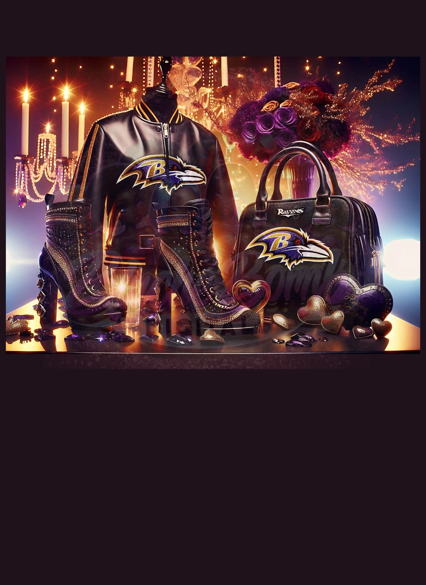 Elevate your game day spirit with this luxurious Baltimore Ravens-inspired fashion and decor digital artwork. This high-quality PNG features an opulent display of Ravens-themed fashion items, including a sleek jacket, chic handbag, and stylish boots, all set against a backdrop of golden accents and glowing lights. Perfect for creating standout sublimation prints, digital projects, or unique game-day decor!