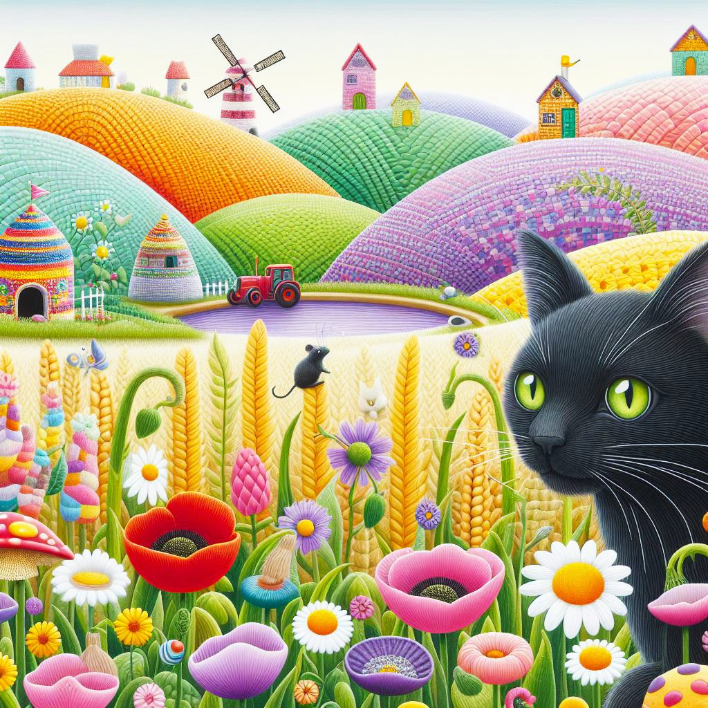 A black cat wandering through a corn field on high patterned hills with poppies, daisies, & toadstools. There are humming birds & butterflies. There is a colourful windmill & a mouse hides in a flower.